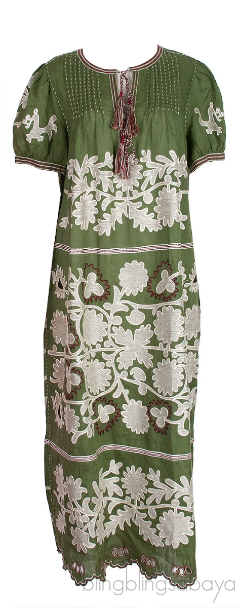This Petra Tasseled Embroidered Linen Midi Dress is crafted in green linen fabric features a round neck, short puff sleeves, tied tassel neckline, white floral pattern, side pockets and scalloped hem.