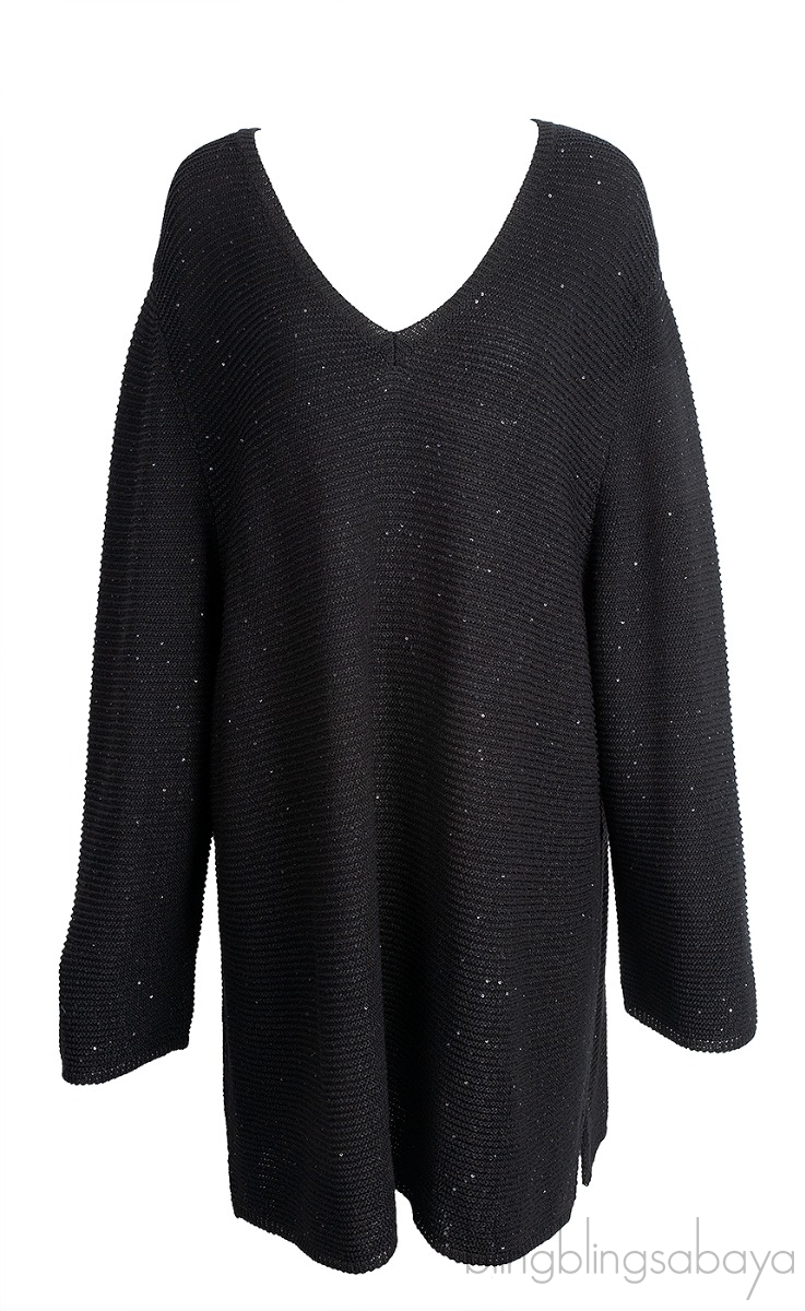 This Black Sequin Long Sleeve Knitted Sweatshirt from Voyage by Marina Rinaldi is crafted in 80% Cotton and 20% Polyester in black knitted fabric featuring a v-neckline, long sleeves, pull-over style with black sequin embellishment all-over and side slit at hem.