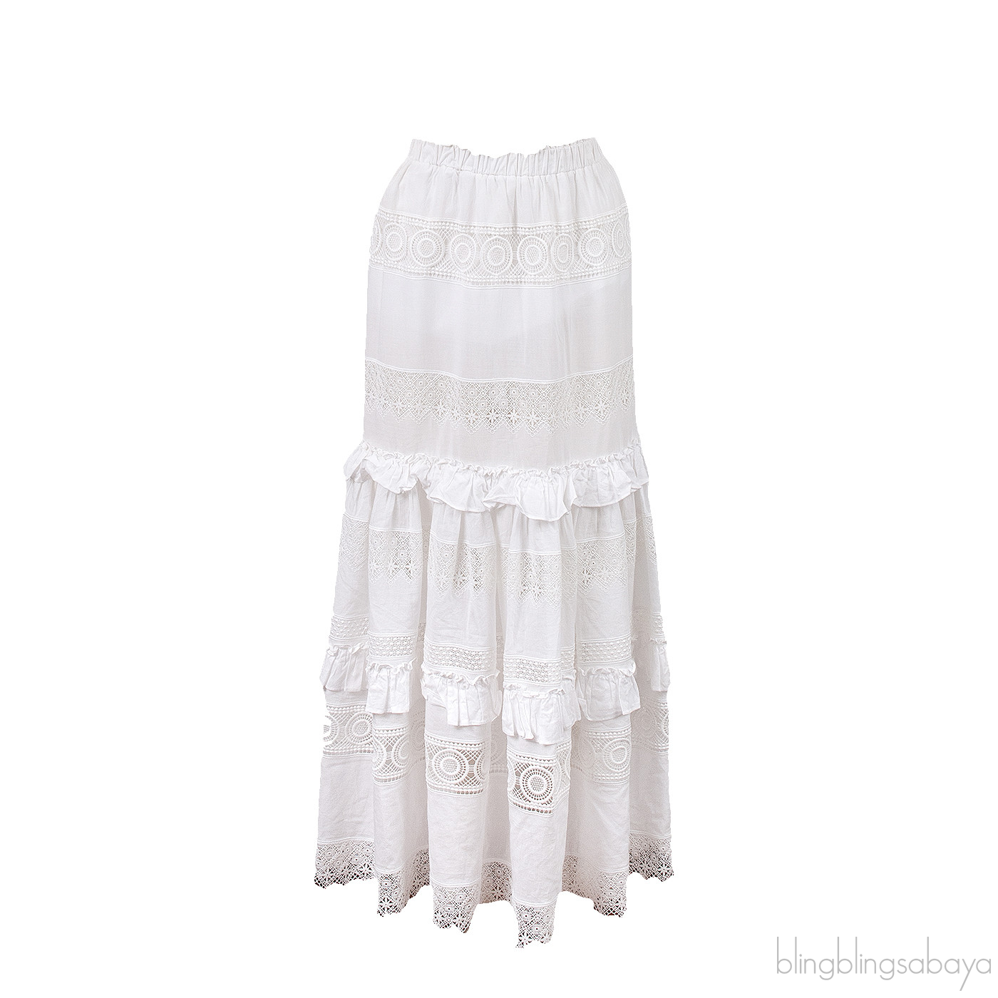 Waimari White Ruffle Trim Maxi SkirtThe Waimari White Ruffle Trim Maxi Skirt is crafted from a luxurious blend of 25% cotton and 75% polyester. It features an elastic waistline, delicate tiered ruffle detailing, and a flowing maxi length with a scalloped hemline, offering both comfort and elegance.