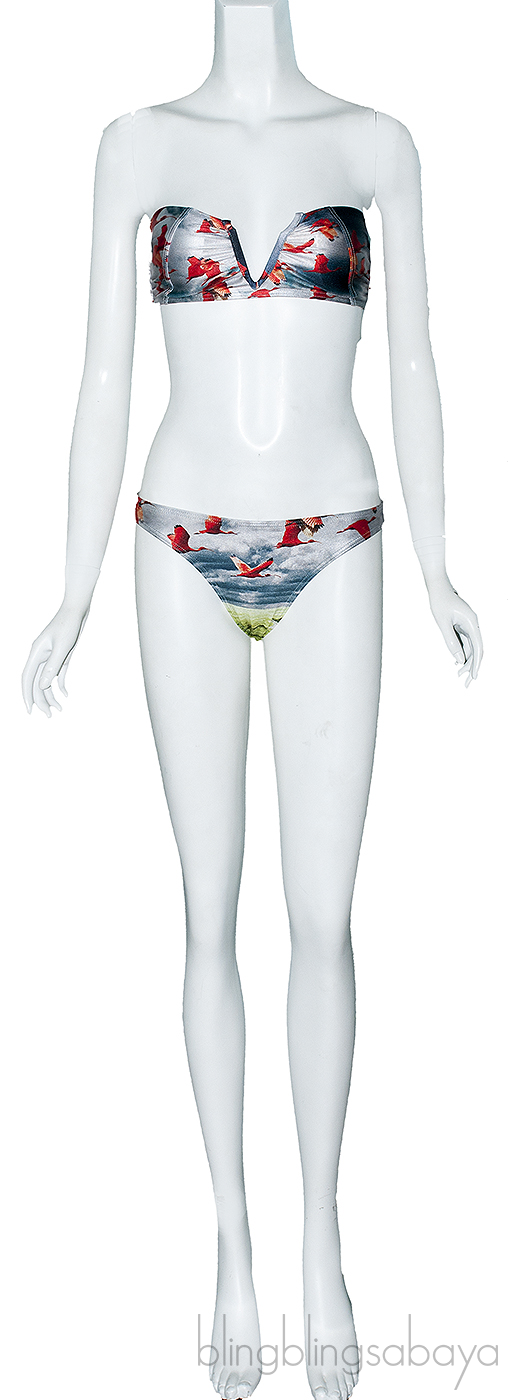 this Flamingo Printed Bikini & Top from We Are Handsome are crafted in 80% Polyester and 20% Lycra in multi-color hue with Flamingo bird printing all over. Bikini strapless top and a v-cut design with gunmetal hook & eye closure and this is accompanied with printed bikini bottom.