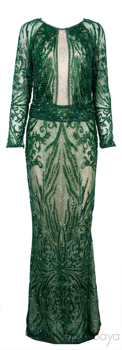 This Emerald Green Bead Embellished Gown from Yolan Cris is crafted from 60% Plastic, 25% Polyamide and 15% Polyester. This evening dress features a mesh fabric beatifully embellisher with emerald green beads and sequins, long sleeves, round neckline, zip fastening at rear, maxi length with slighty long back hem.
