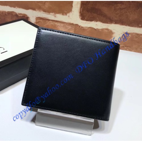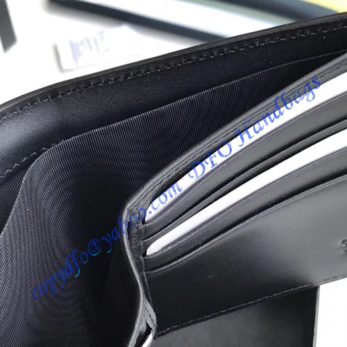 This Gucci wallet features smooth black leather and a metallic gold print, which makes it classy and modern at the same time. Inside, there is a black moiré lining, eight card slots, as well as two bill compartments. In short, it has everything a wallet should have.