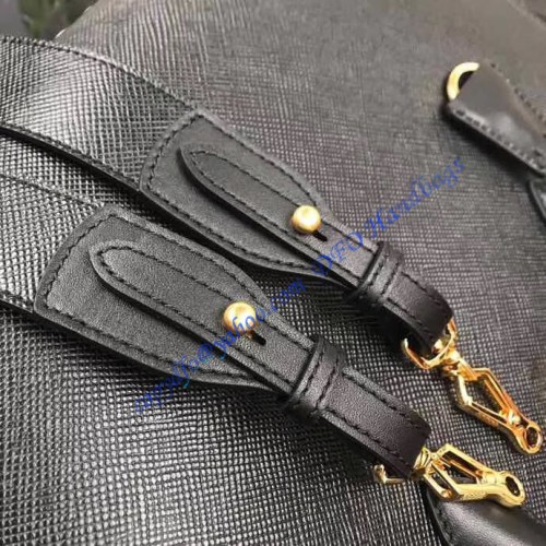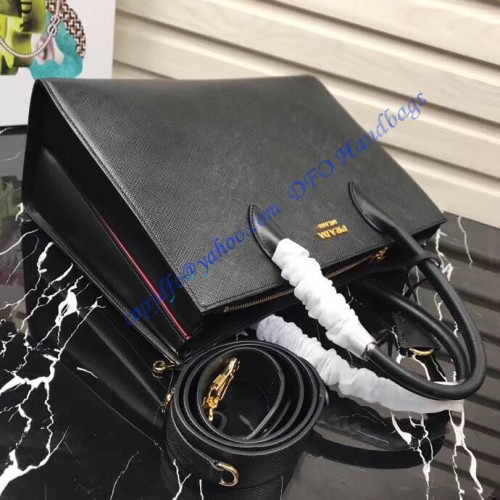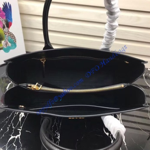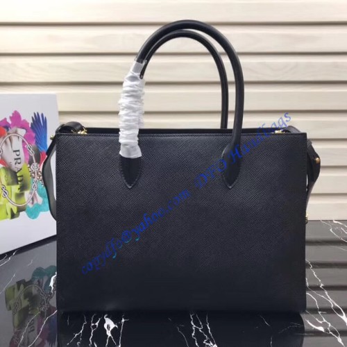 The Prada Saffiano large black leather tote bag is 34 cm wide (13,4 in), 24 cm long (9,5 in), and 13 cm deep (5,1 in).