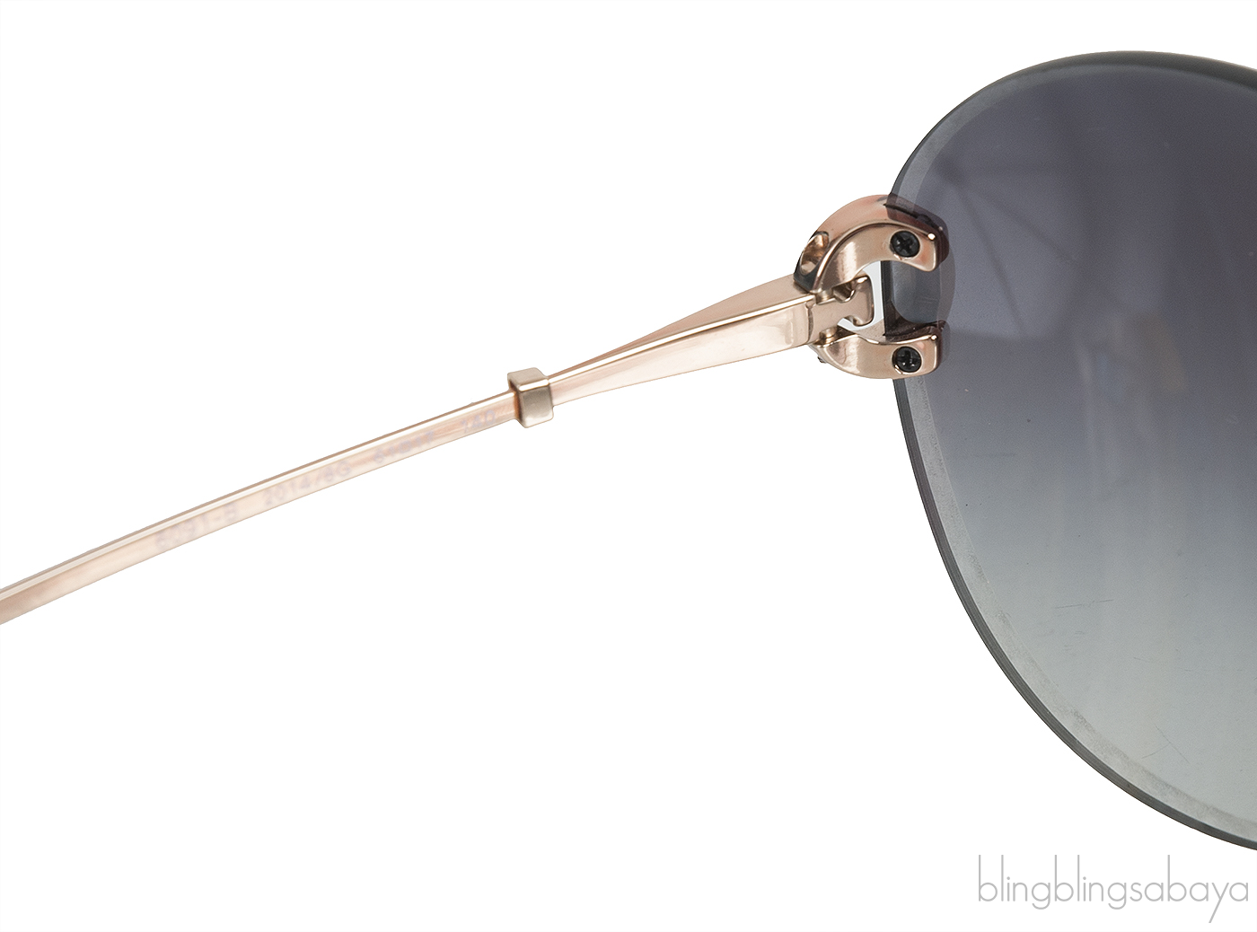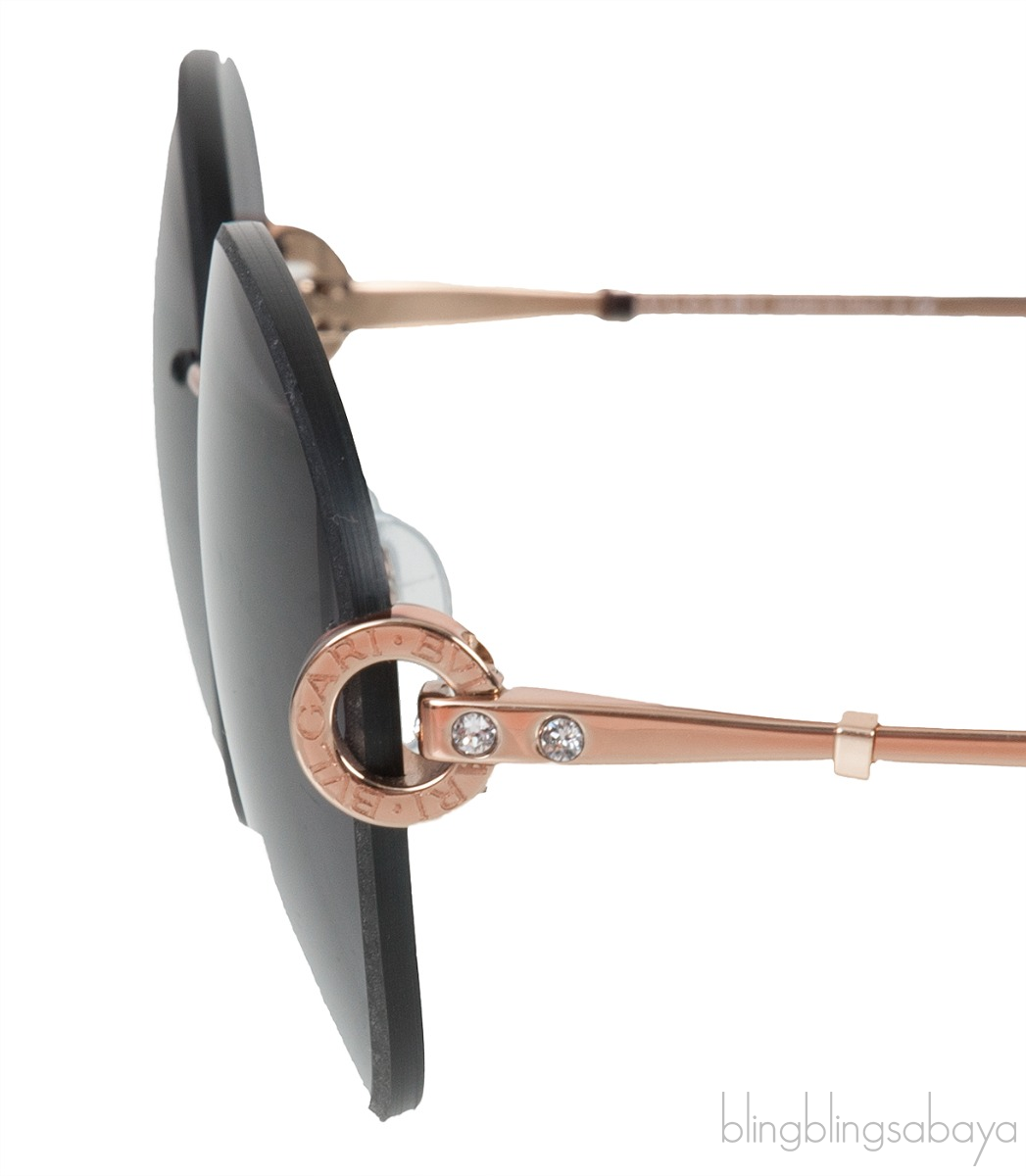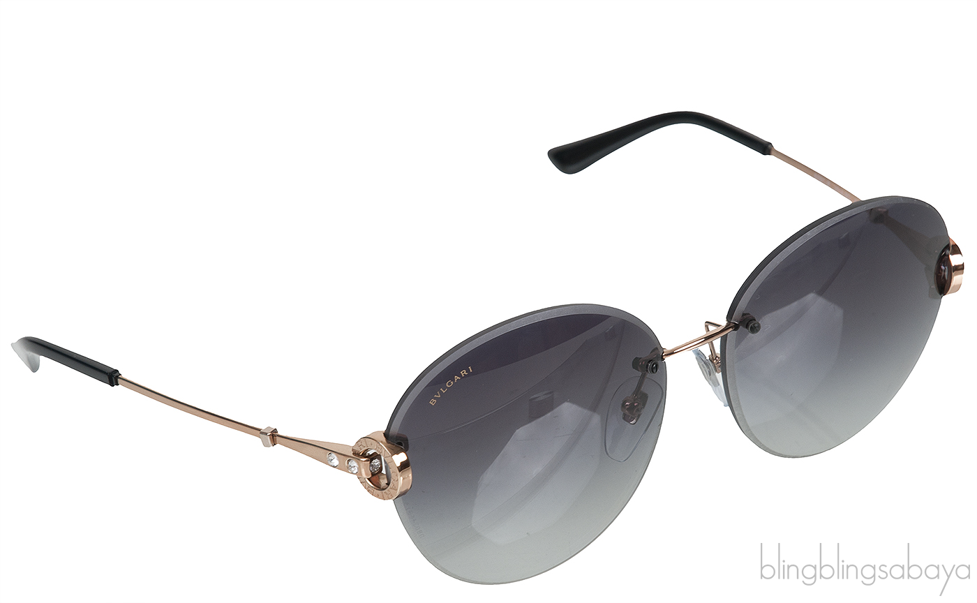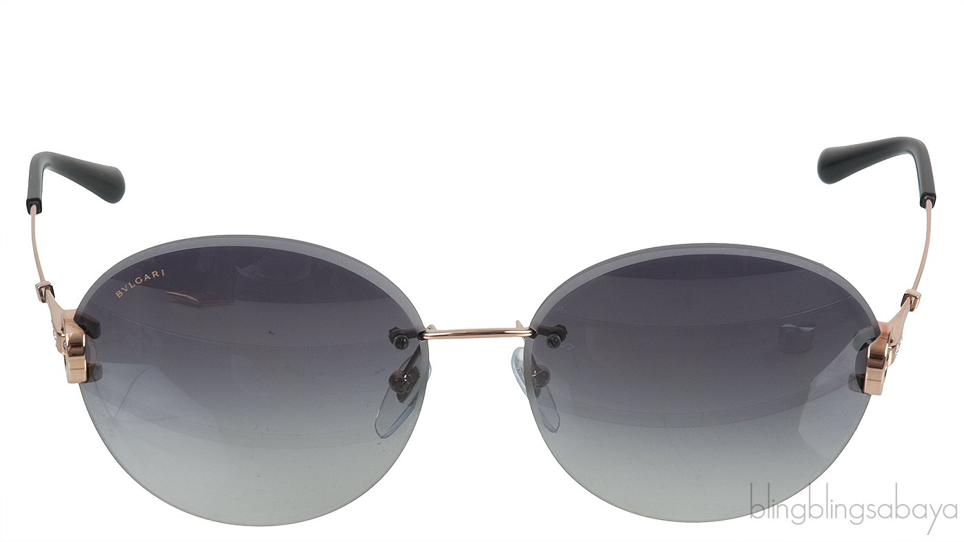 This 6091-B2014/8g Sunglasses from Bvlgari features a rimless grey tinted round lenses, signature round brand engraved at the temple, gold metal hardware, nose pads, and black acetale temple tip.