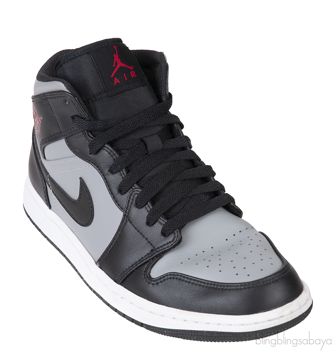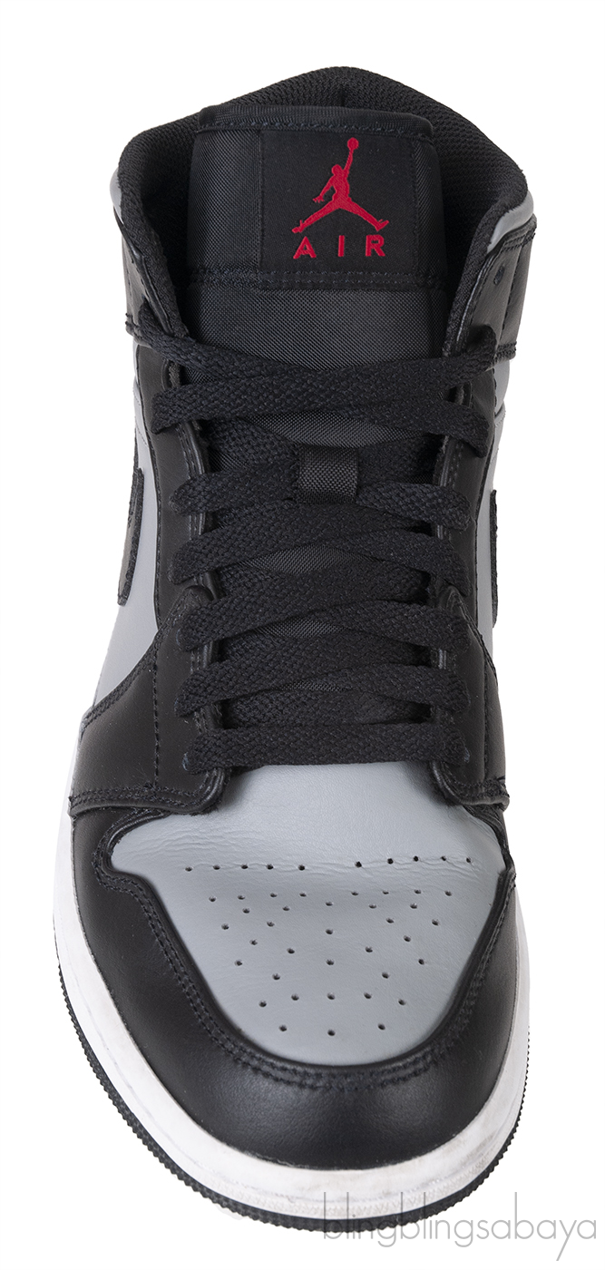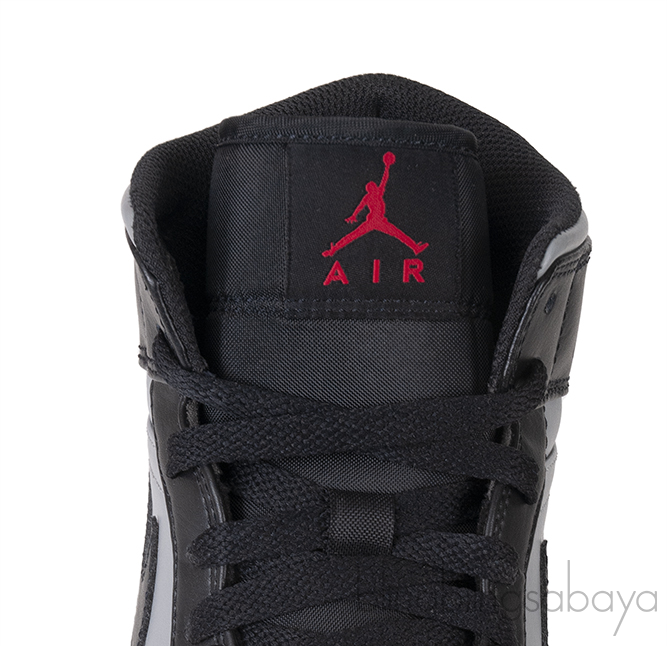 The Nike Air Jordan 1 MID "Shadow Red" sneakers are designed with a grey and black leather upper. They showcase a round toe, contrasting panel details, and a front lace-up fastening for a secure fit. The sneakers are highlighted by the classic Air Jordan Wings logo2 and the signature Swoosh logo2. Additionally, they feature a branded insole for added comfort and a durable rubber sole for traction and support.