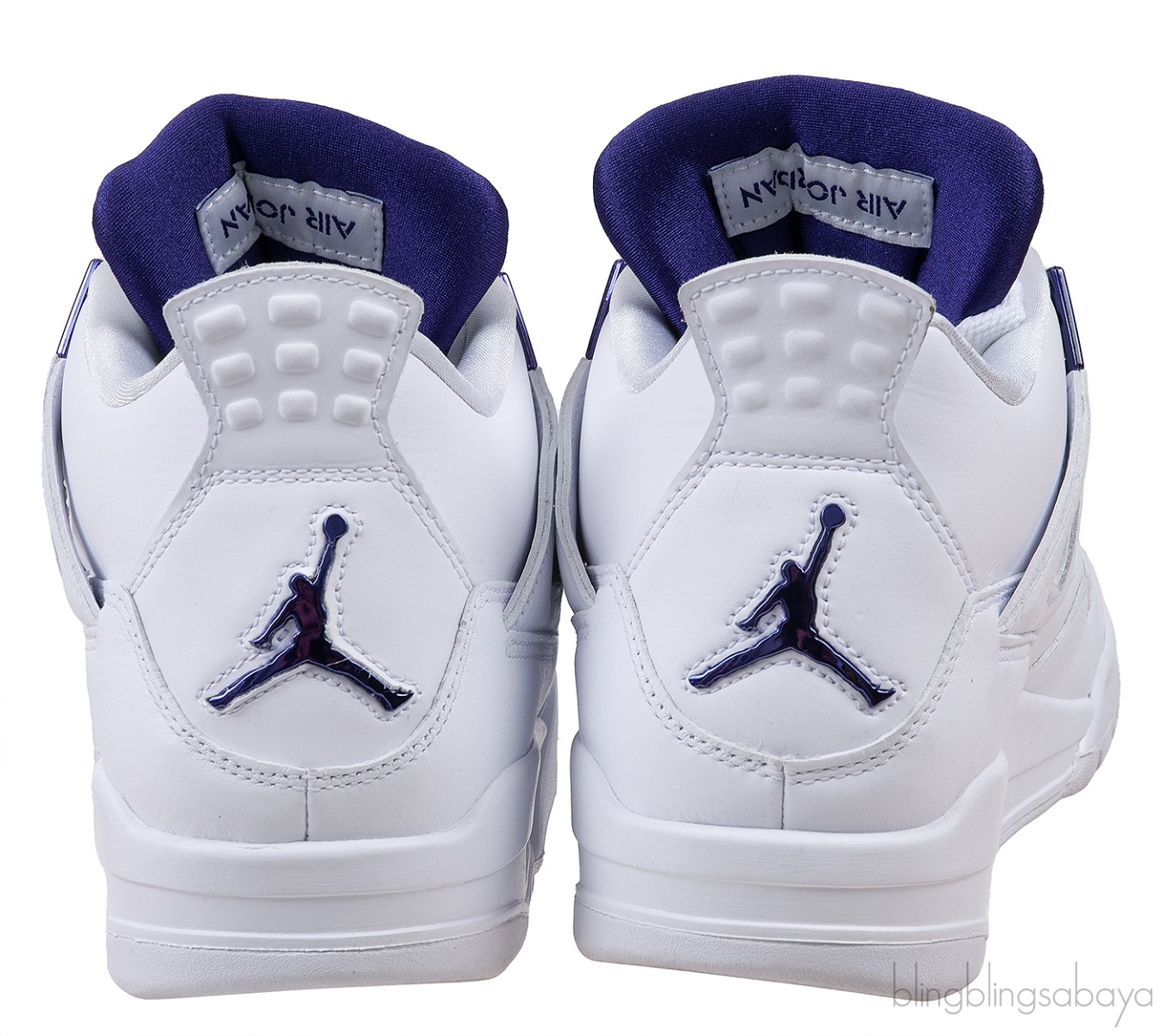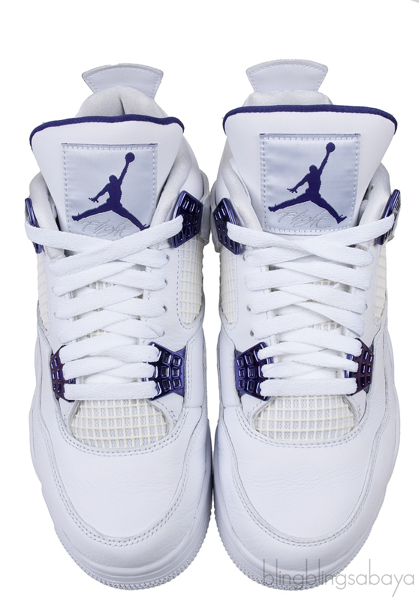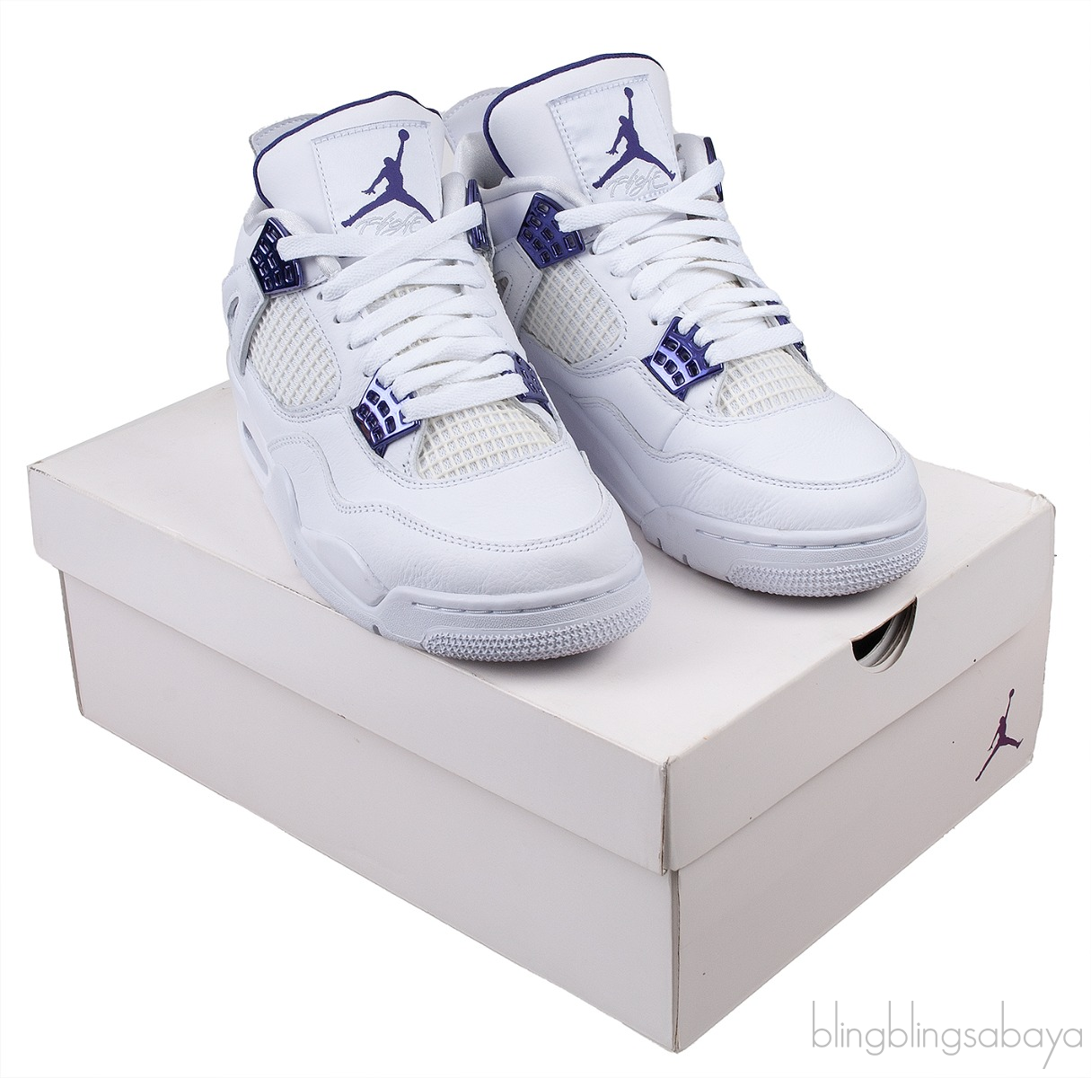 These Air Jordan 4 Retro Sneakers Purple from Jordan are crafted from white leather upper. These shoes have a metallic purple finish on the TPU lace eyelets and the Jumpman emblem on the heel of the full-grain leather upper. The tongue logo2, visible Air unit, and inner lining all have a complementary purple color. The sole is made of white rubber.