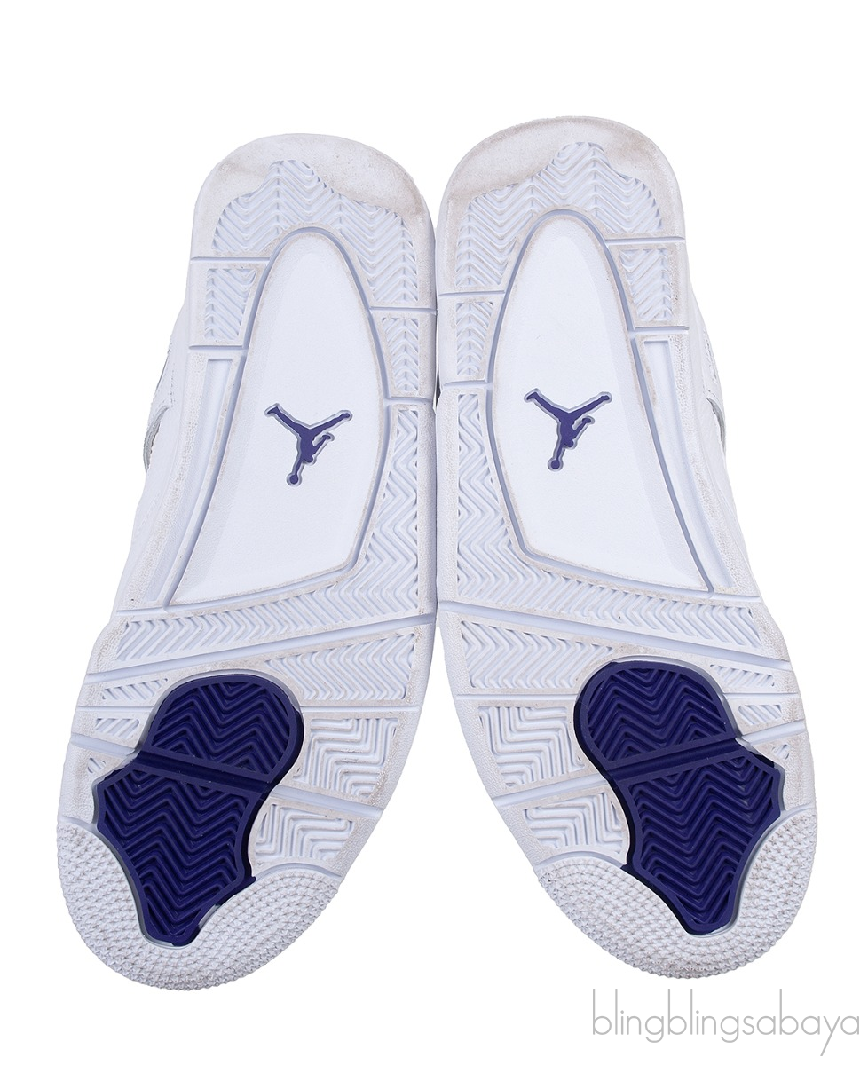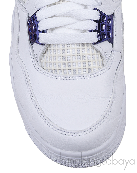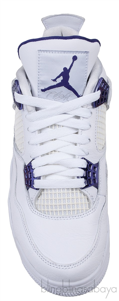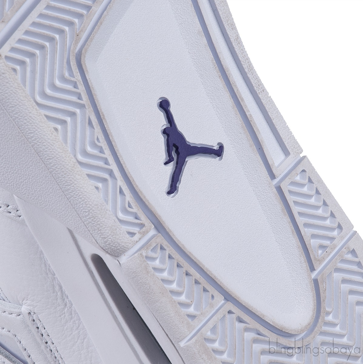 These Air Jordan 4 Retro Sneakers Purple from Jordan are crafted from white leather upper. These shoes have a metallic purple finish on the TPU lace eyelets and the Jumpman emblem on the heel of the full-grain leather upper. The tongue logo2, visible Air unit, and inner lining all have a complementary purple color. The sole is made of white rubber.