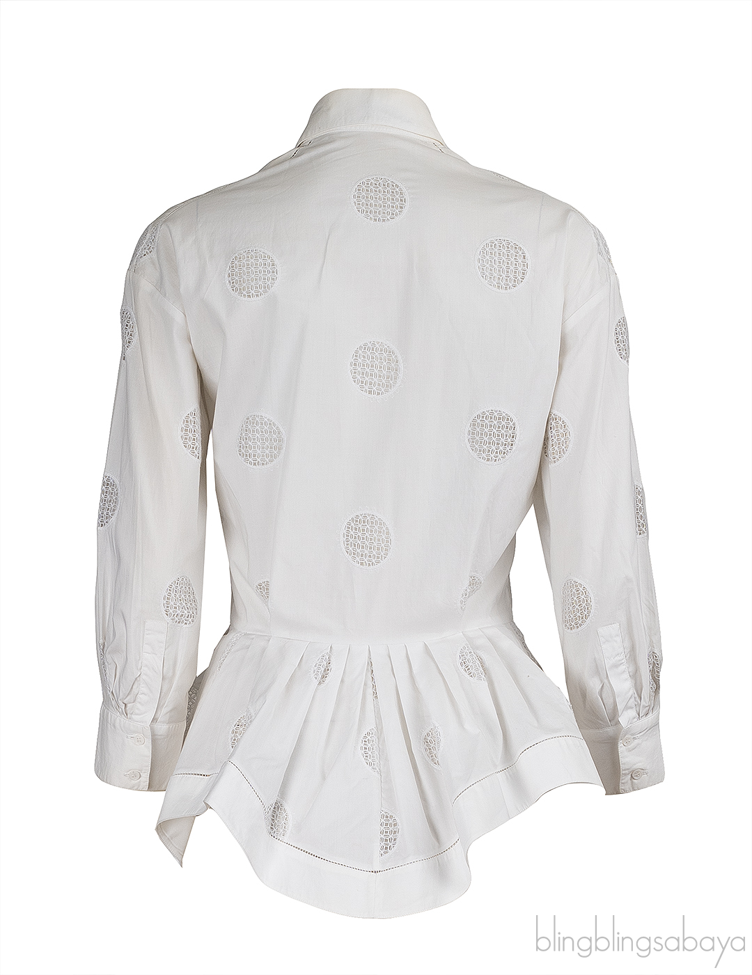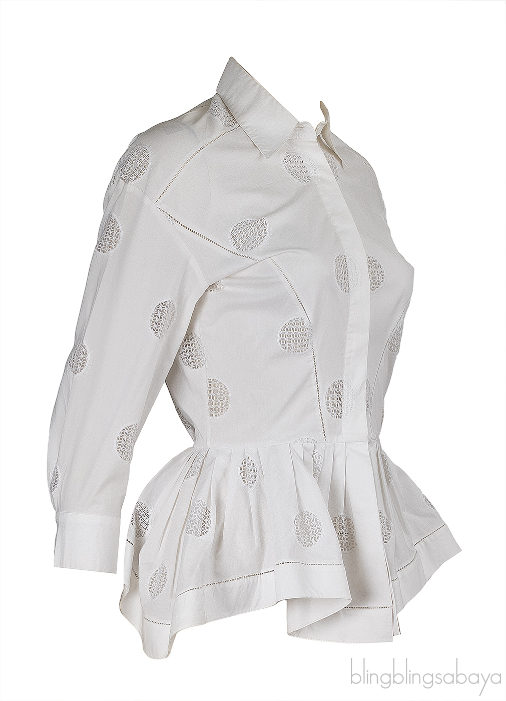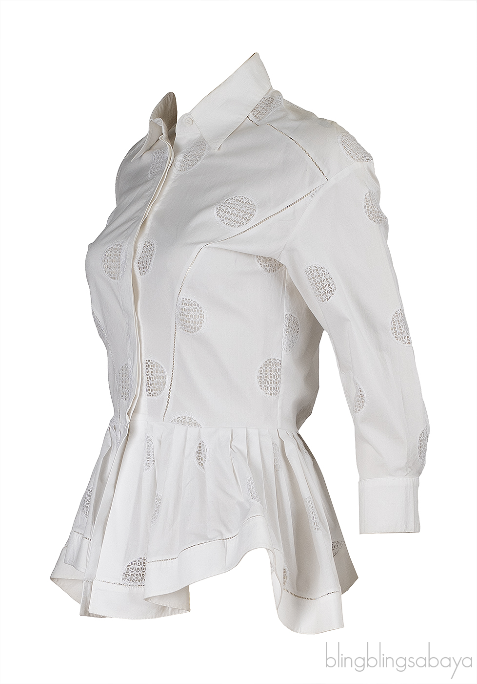 This Alaia White Cotton Peplum Shirt is crafted from 100% Cotton in white featuring a classic pointed collar, button fastening through the front, peplum design, third quarter sleeves with button cuffs.