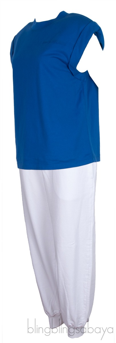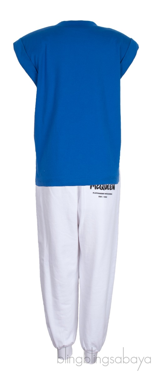 This pair of Blue Padded Shoulder Top & White Jogger from Alexander McQueen is crafted from 100% Cotton. Top features a crew neckline, padded shoulder, sleeveless; logo2 embroidered at left chest and has lining.