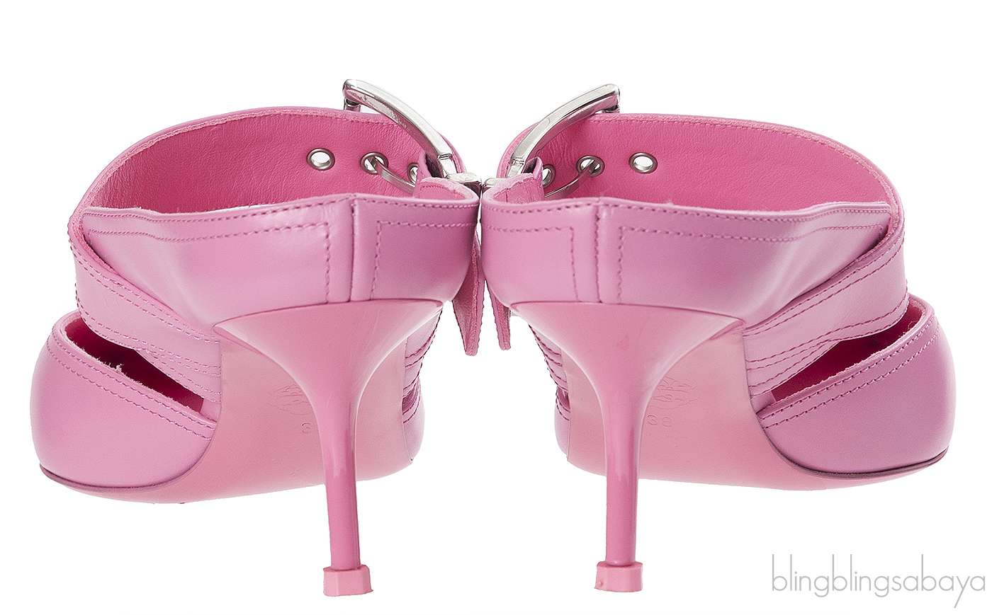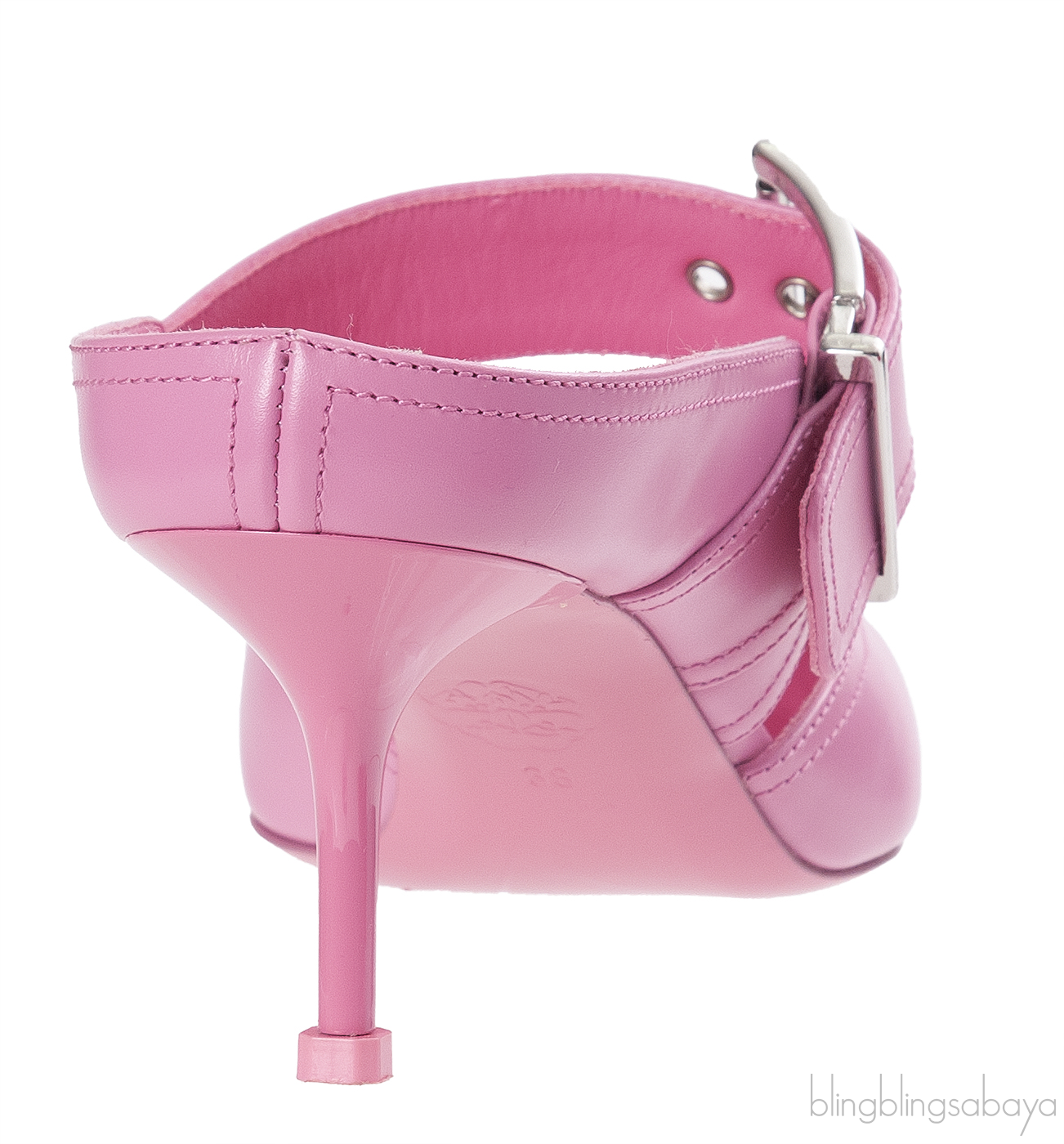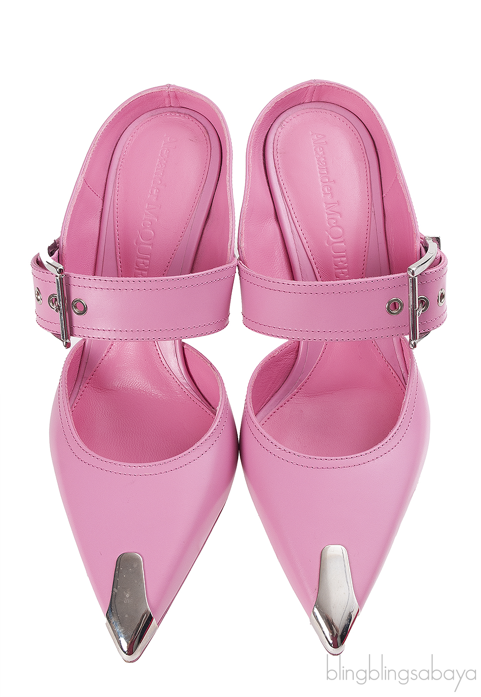 This Alexander McQueen Pink Punk Buckle Mules pair is crafted from pink calf leather and lined with leather. These mules features a pointed-toe silhouette with a metal toe cap, buckle detail, leather lined insole and sole and a high stiletto heel.