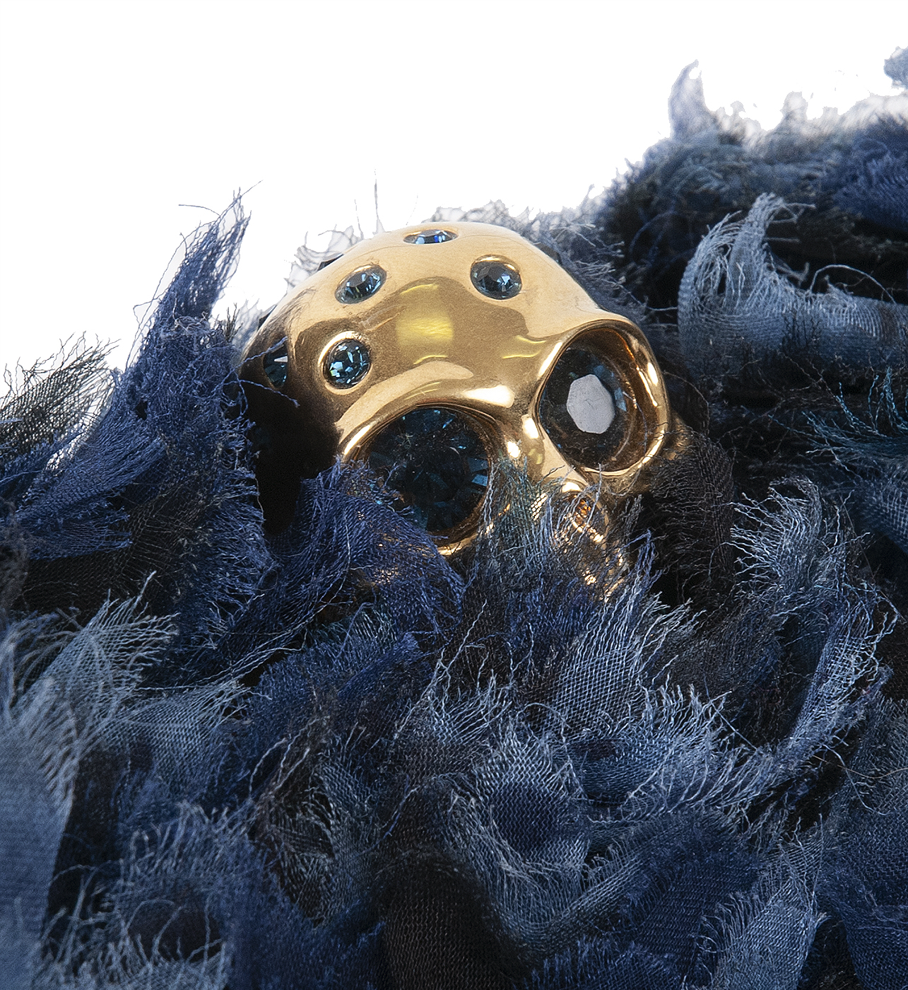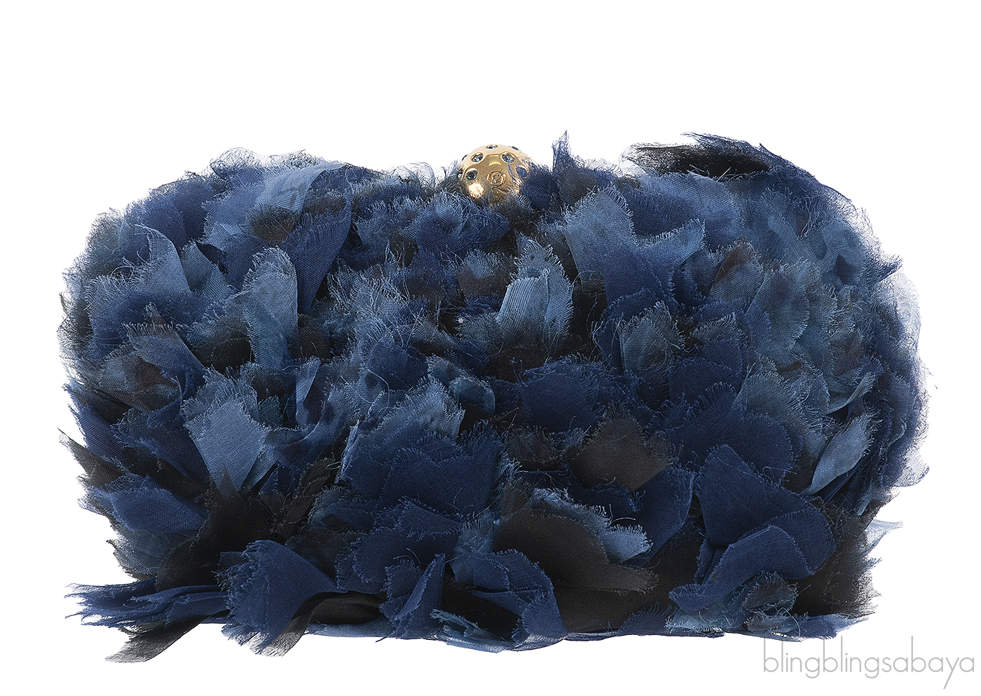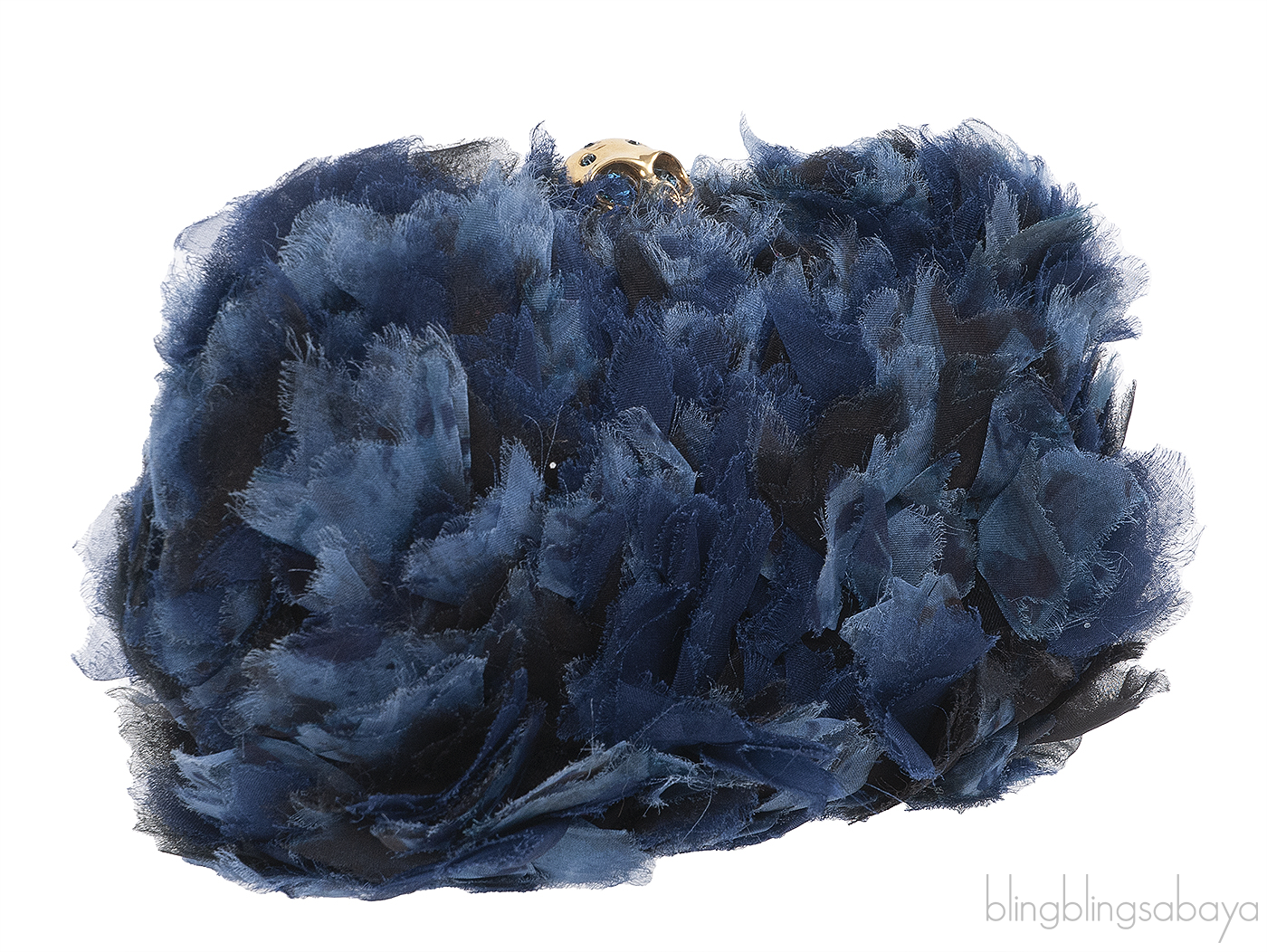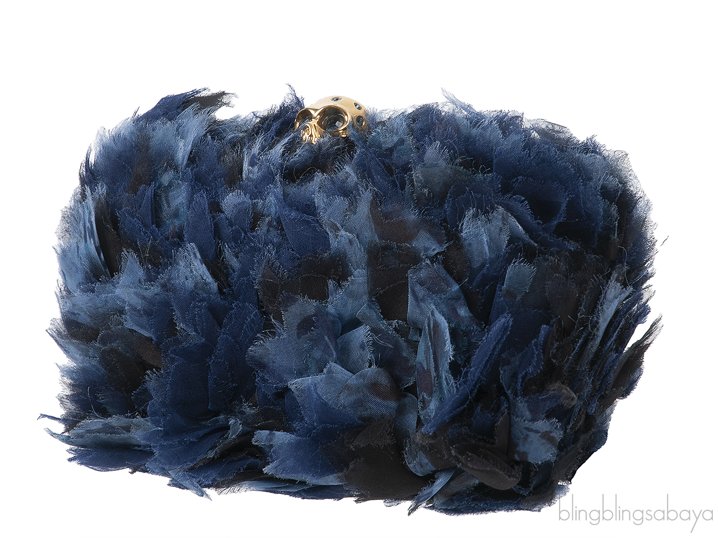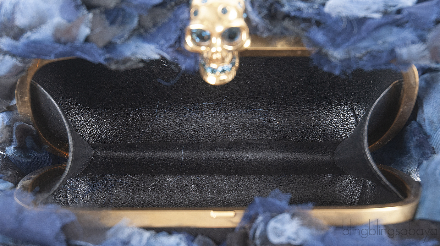 This Skull Fabric Embellished Hard Clutch from Alexander McQueen features a hard case oval shape fully covered with tri-color oraganza fabric that create a brilliant feather-like effect. This clutch has gold and blue-toned crystal-embellished skull clasp at top, a gold tone metal frame and the interior is fully lined with black leather.