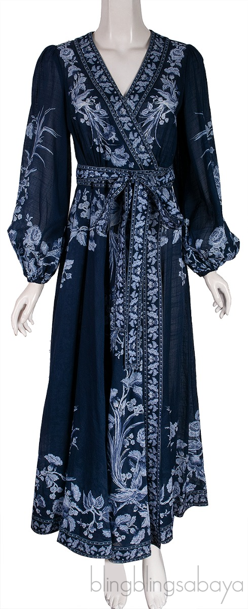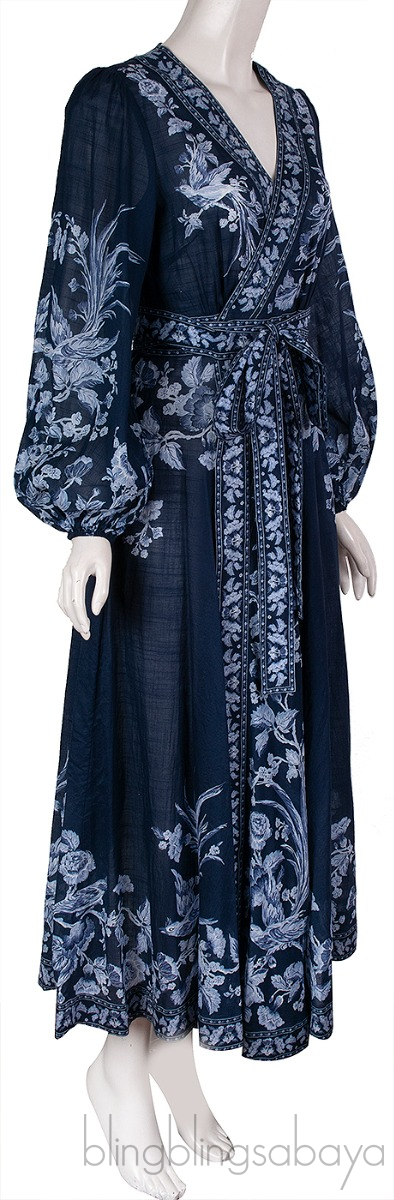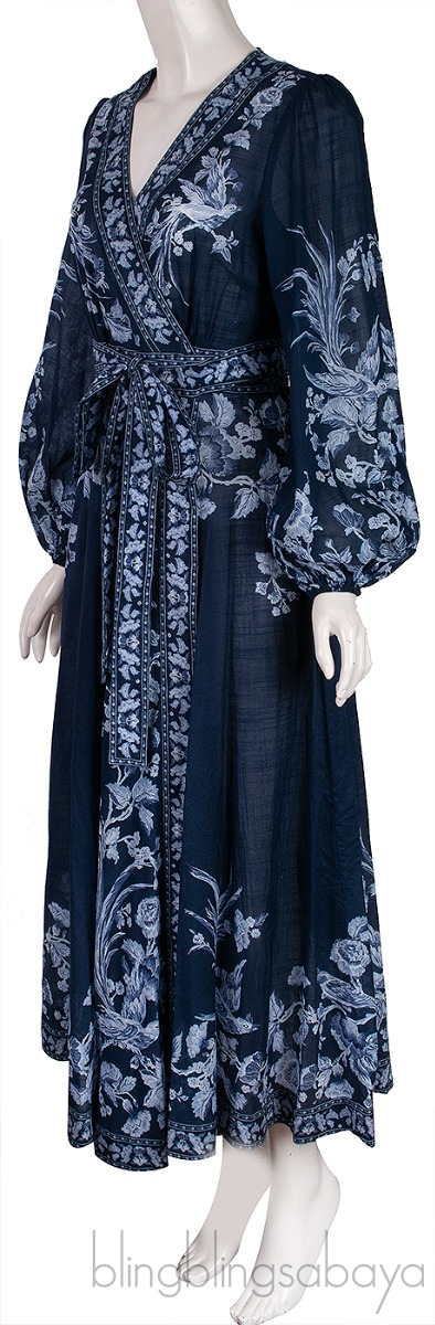 This Aliane Floral Print Cotton Wrap Dress from Zimmermann is crafted from 100% Cotton fabric in blue hue This beautiful dress features a contatrasting white floral print, wrap design and self-tie belt. It has a v-neckline, blouson sleeves and mid-length hem.