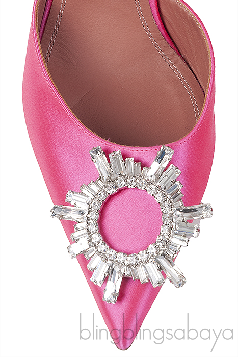 These Begum Crystal-embellished Satin Slingback Pump from Amina Muaddi are made pink satin upper, leather lining and decorated with glittering crystals around the pointed toe by Venetian artisans for a barely-there impression.
