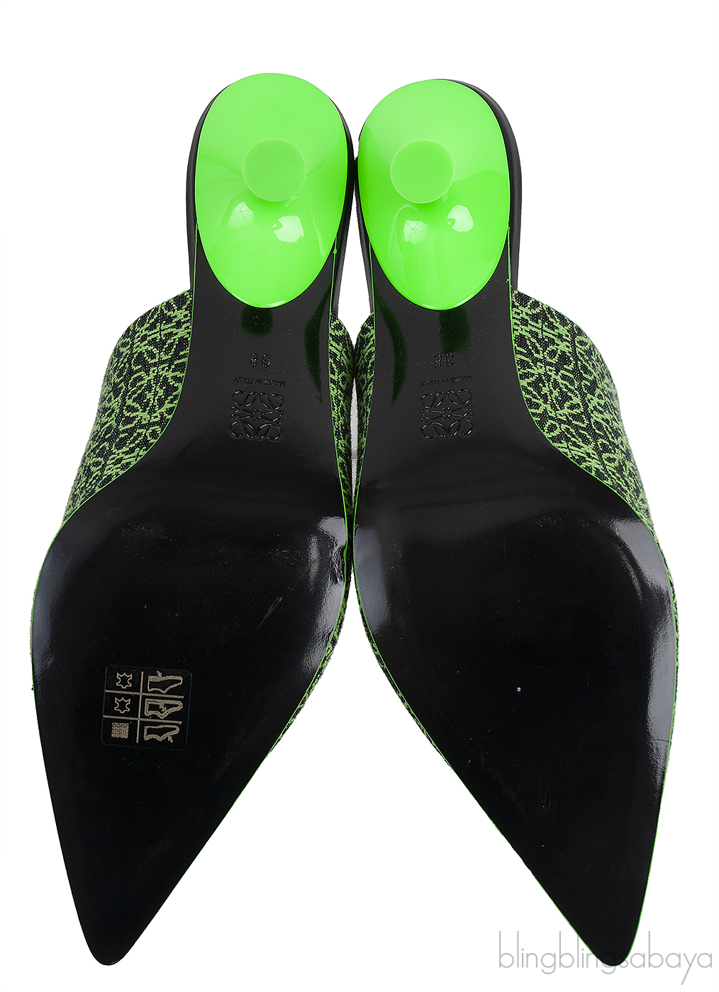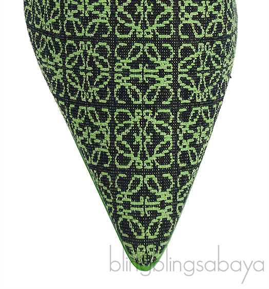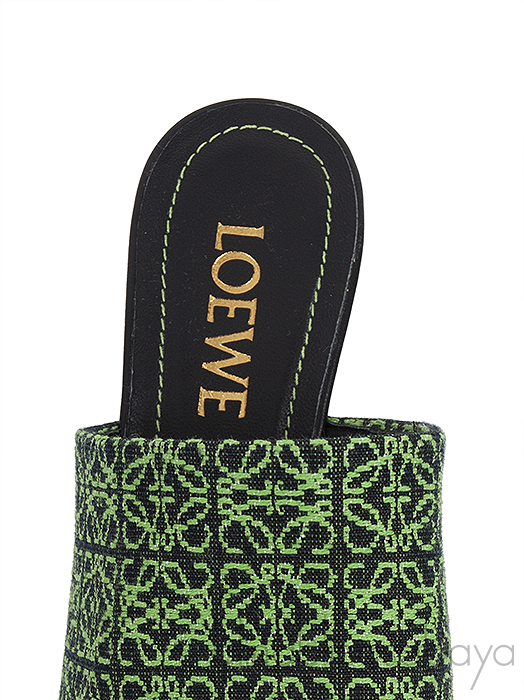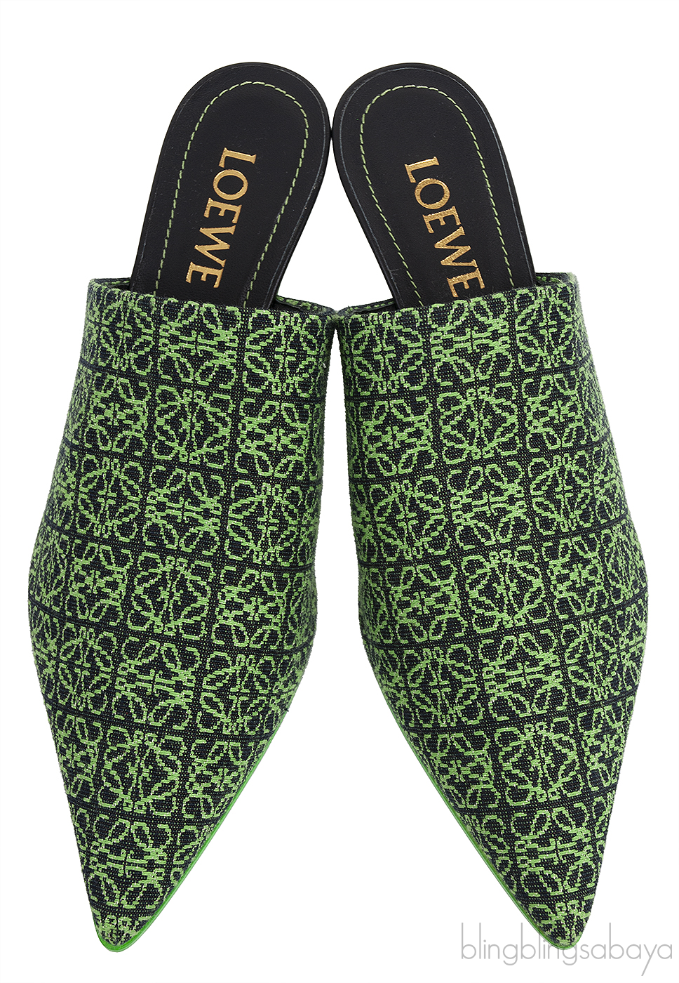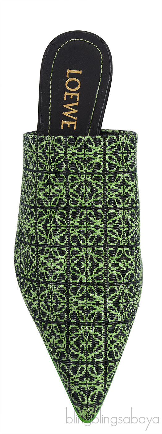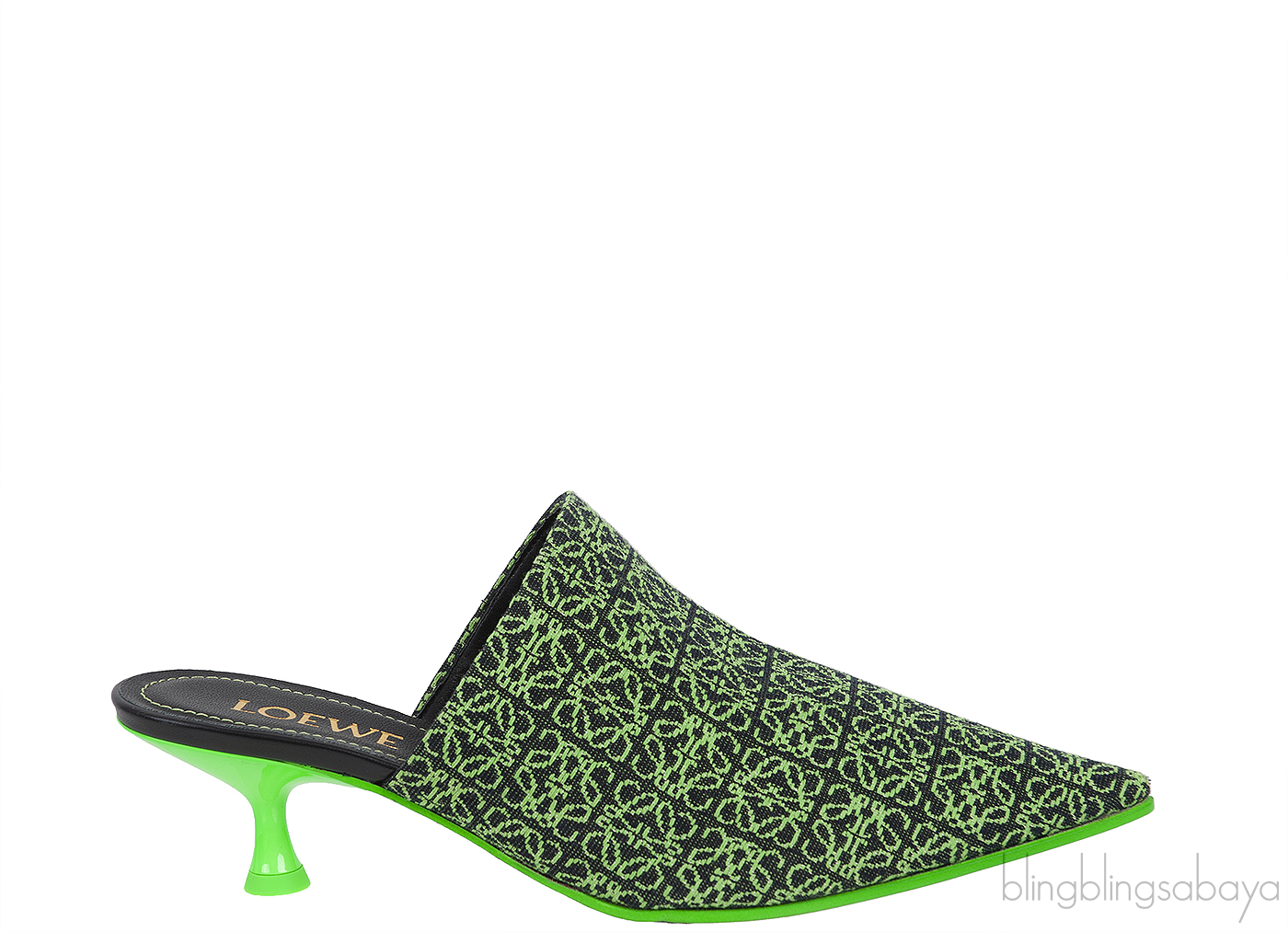 These Anagram Embroidered Fabric Pointy Mules from Loewe are crafted from fabric upper with leather lining. These mules features a pointed toe, anagram embroidered design,, slip on, leather lined insole and sole and green mini kitten heels.