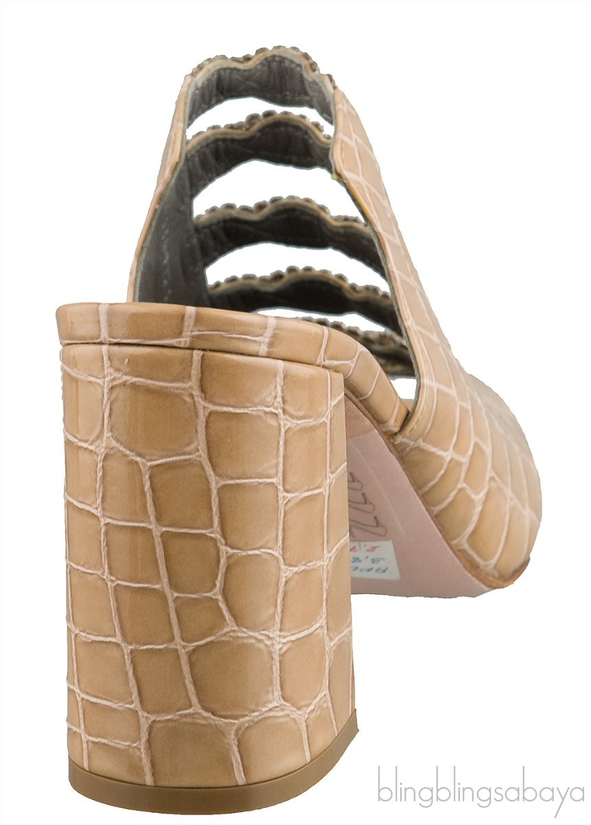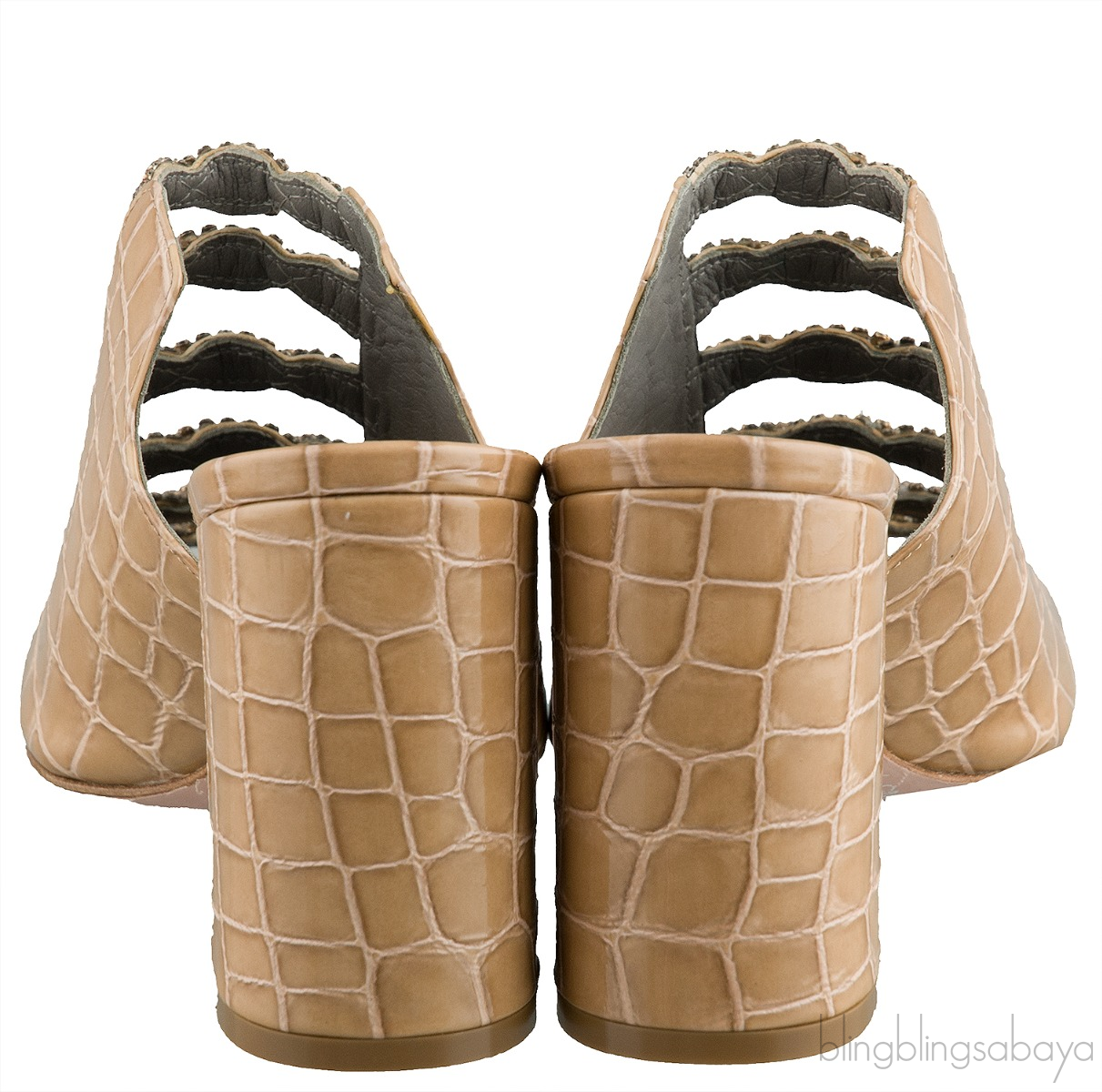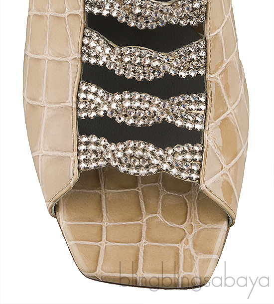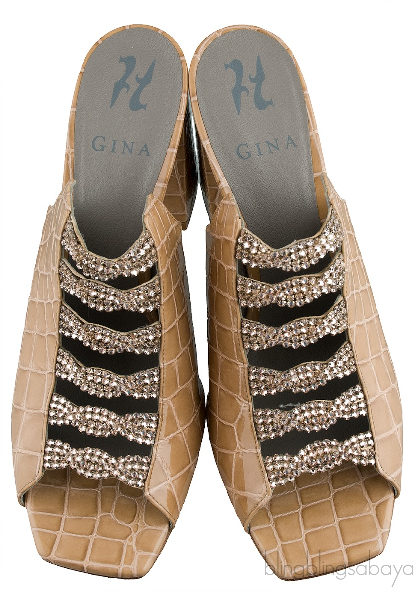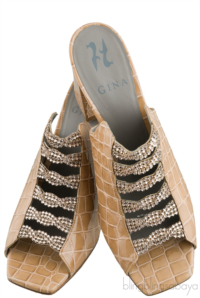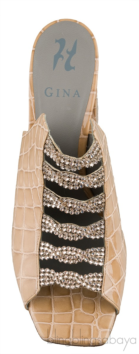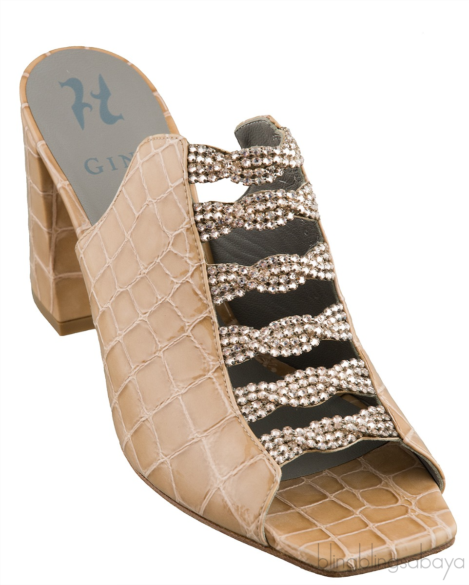 These Apollo Shadow Louis Mule from Gina is crafted from beige crocodile print leather upper with grey leather lining. These mule sandals features a crystal detailing, square toe, leather lined insole and sole, and stacked heels measuring 90 cm high.