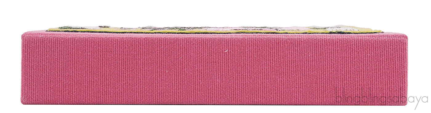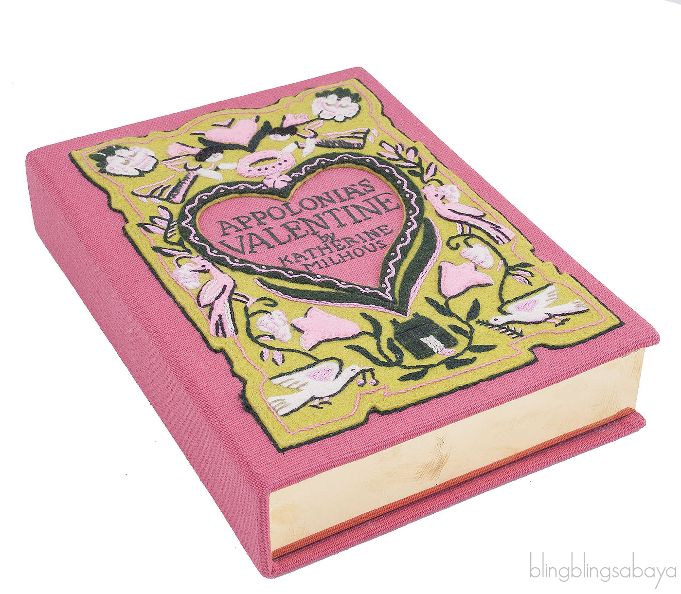 This Appolonia's Valentine Embroidered Clutch from Olympia Le-tan is a must have for the season of love. This handcrafted Pink cotton canvas clutch features a multicolored embroidery and felt, heart design at front with "Appolonias Valentine by Katherine Milhous" embroidered at the mid centre, designer-stamped gold metal frame, stitched identity number at back and interior fully lined with paisley heart print with small slit pocket.