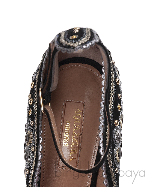 These Black Embellished Jaipur Pumps from Aquazzura from black suede upper decorated with bright mirrored and embroidered embellishment and leather lining. These heels features a pointed toe, buckled ankle straps, and are set on slim stiletto heels for a leg-lengthening effect.