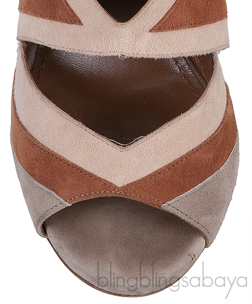 These Tri-color Suede Peep Toe Sandals from Aquazzura are crafted form suede upper with brown leather lining. These heels features a tri-color cut-out design, peep almond toe, string fastening at the back of the heel. leather lined insole, leather sole and heels measuring 100 mm high.