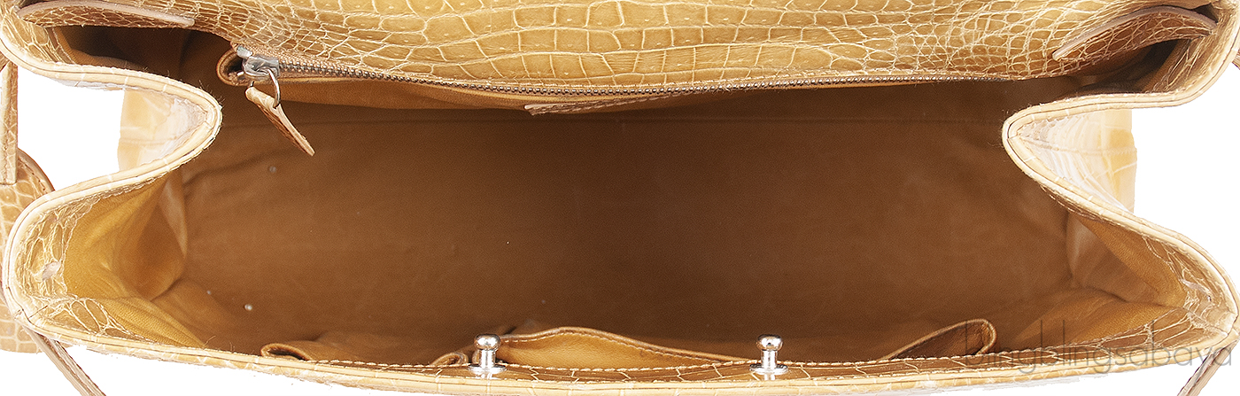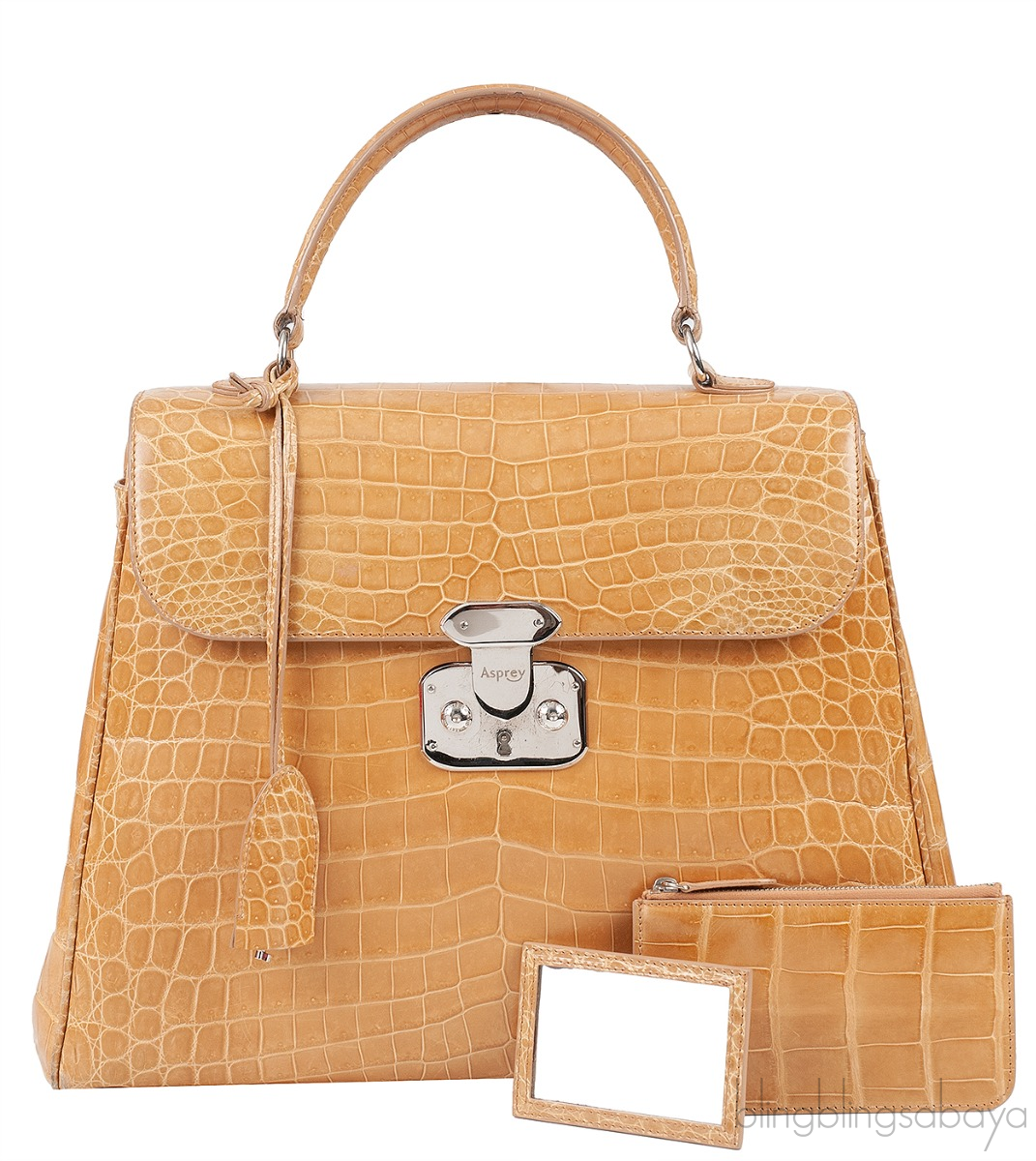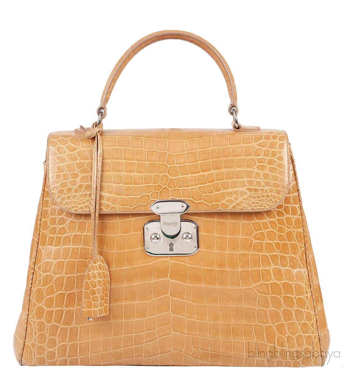 This Brown Crocodile Large Handbag from Asprey is crafted from light brown exotic crocodile leather accented with the silver hardware. This bag features a single top handle, flap cover, key holder with key, and has the fastening straps on both side with stamped fold over clasp closure.