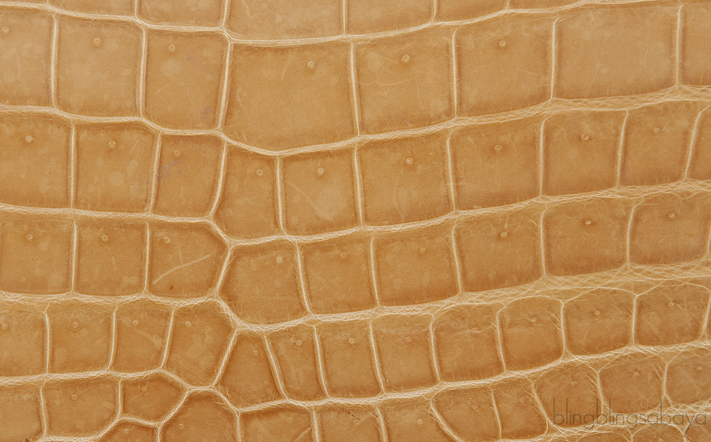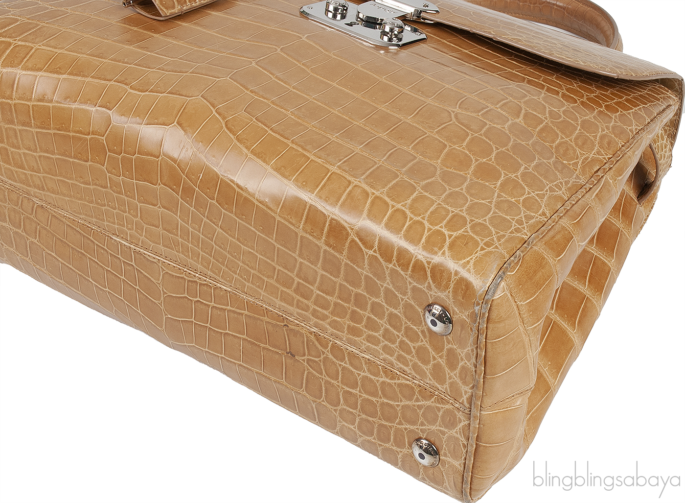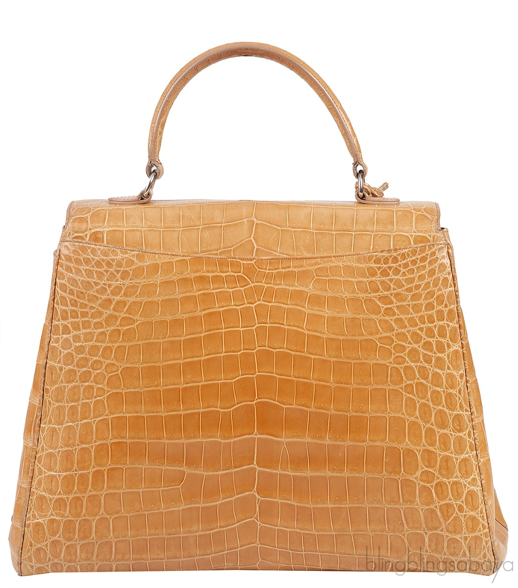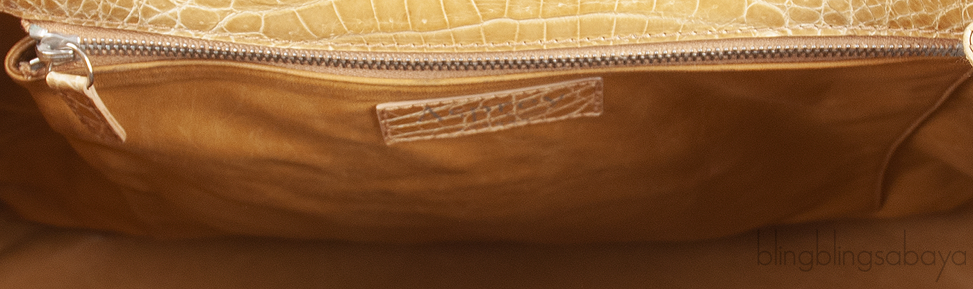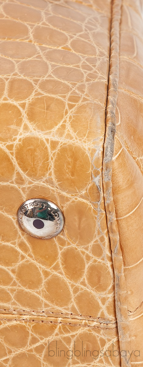 This large bag has an interior fully lined with brown leather lining and has zip pocket, cell phone compartment and patch pocket inside. This bag comes with mirror and a crocodile pouch.