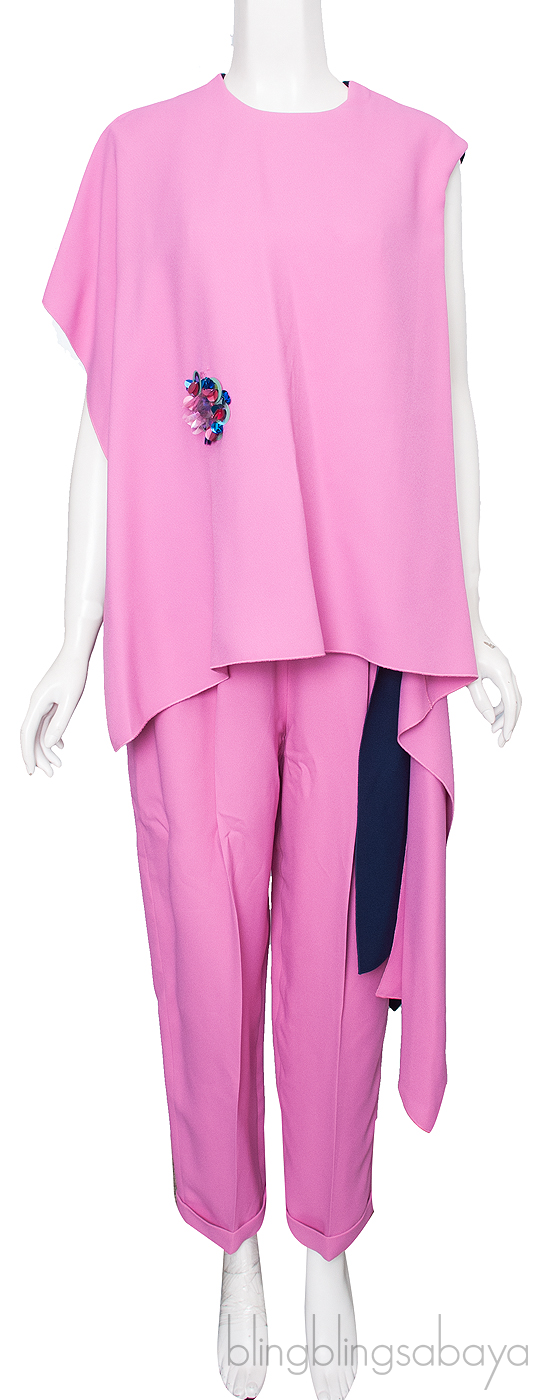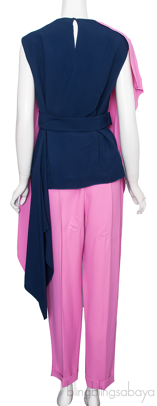 This Asymmetric Top and Trousers from Delpozo is made of 50% acetate and 50% viscose lining 100% silk. Navy blue and pink asymmetric sleeveless blouse from Delpozo featuring a two-tone design, a round neck, a colorful sequinned brooch to the front and an asymmetric hem.