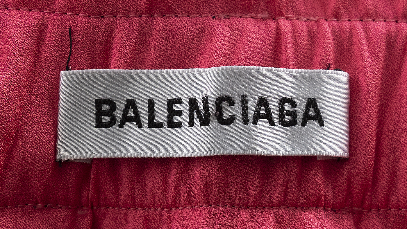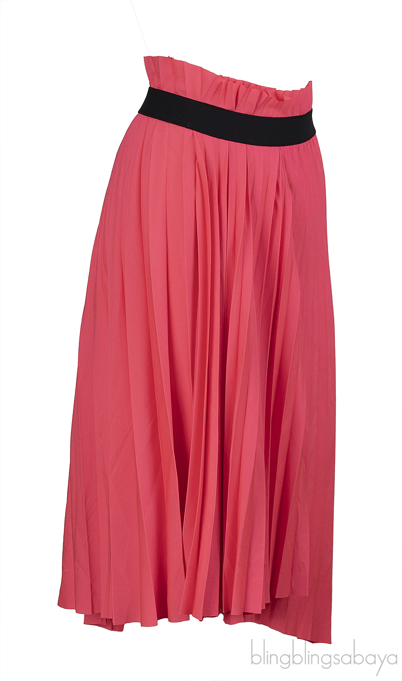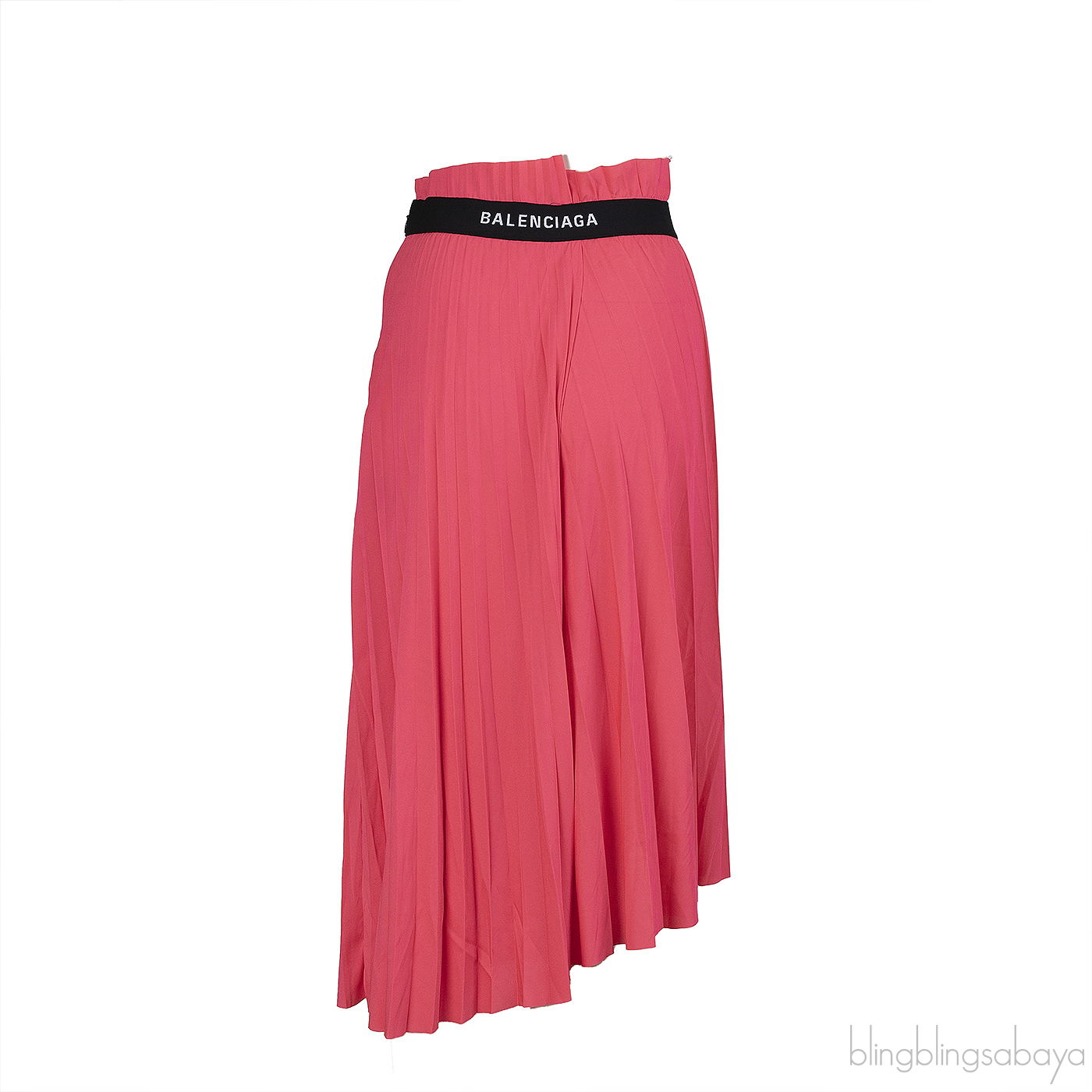 This Balenciaga Pink Pleated Skirt is made from pink fabric. This skirt features a plain pleated design, a white brand logo2 at the waist, an asymmetric hemline, side zip fastening, and a flattering midi length.