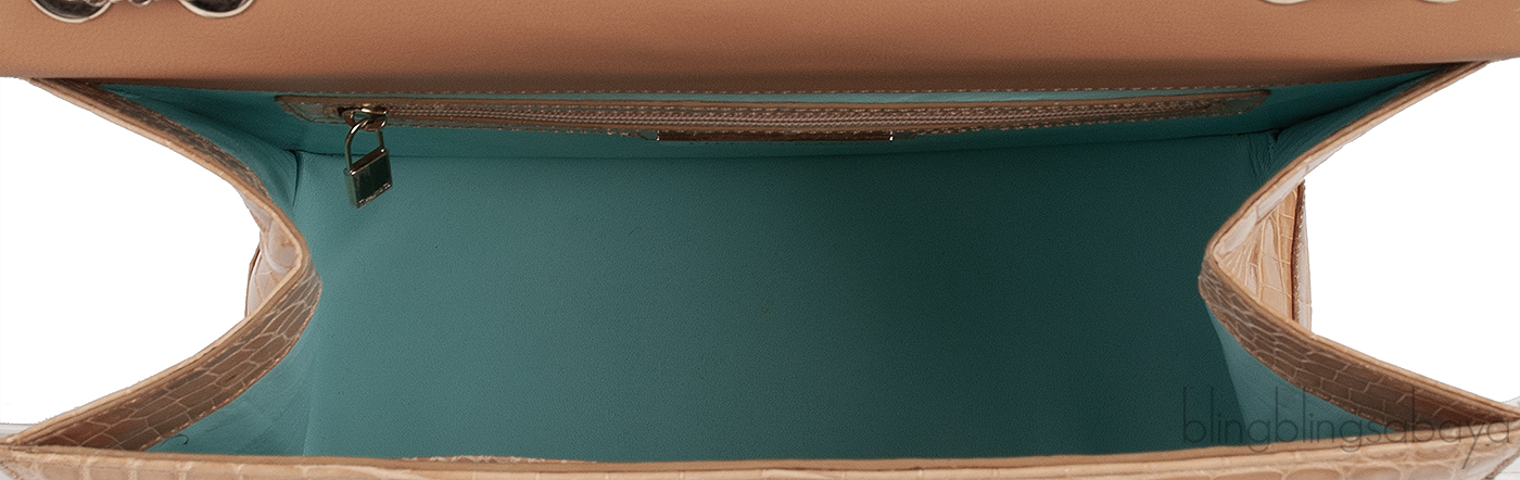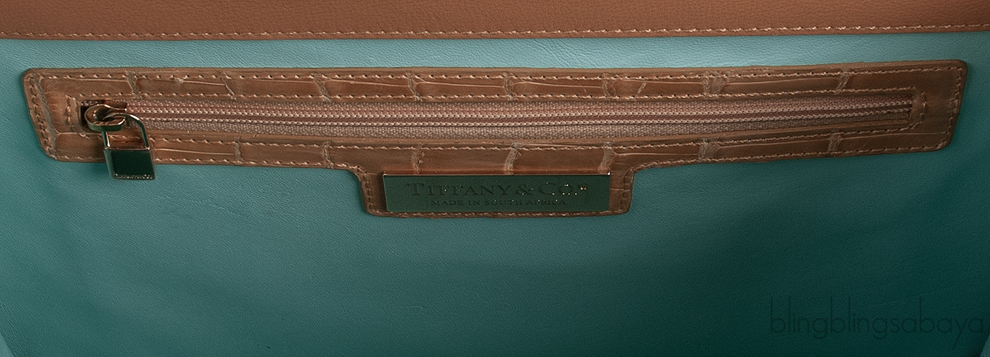 The flap opens to reveal a very roomy interior lined with tiffany blue leather lining and has two patch pockets and zip wall pocket with metal logo2 plate inside.