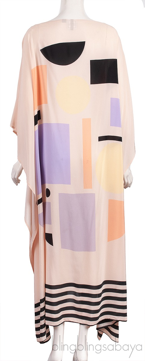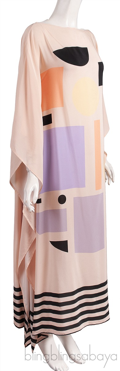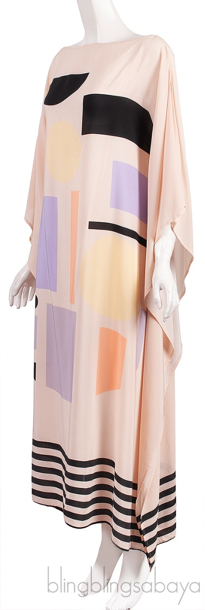 This Beige Multicolor Silk Kaftan Dress from Louisa Parris is crafted from 100% Silk fabric featuring an abstract print in beige, black, beige, and lilac color cut in a simple scarf dress shape with drape sleeves and a boat neckline