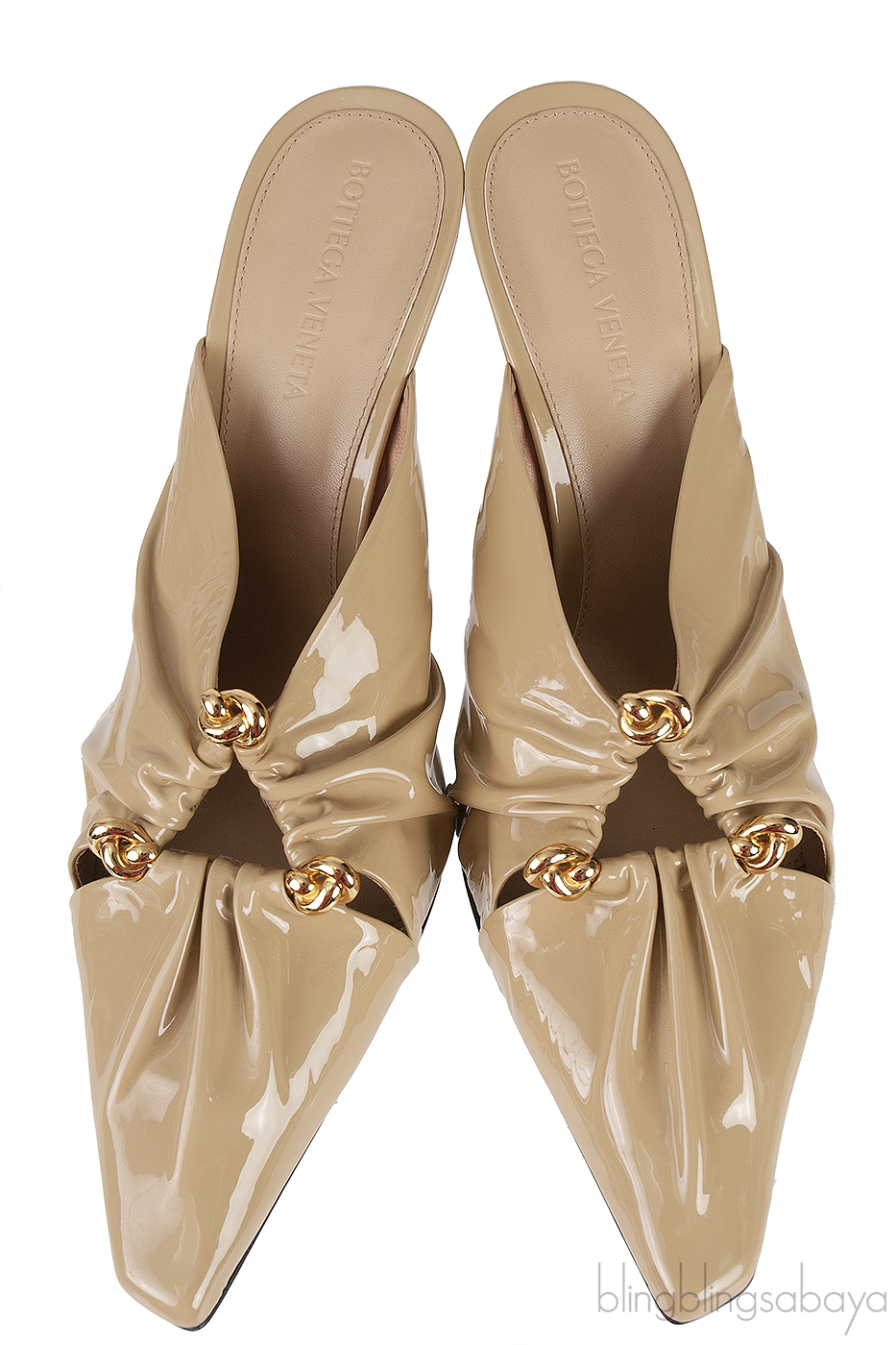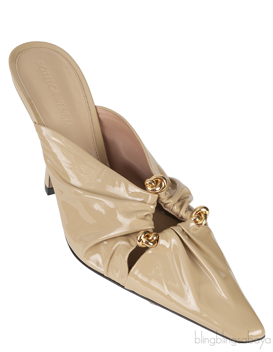 These Beige Patent Leather Bunny Mules from Bottega Veneta are made from sleek, polished calfskin, showcasing a gathered upper with a decorative golden knotted ring accent. They feature a pointed-toe shape, a leather insole and outsole, and are elevated with 90mm heels for added sophistication.