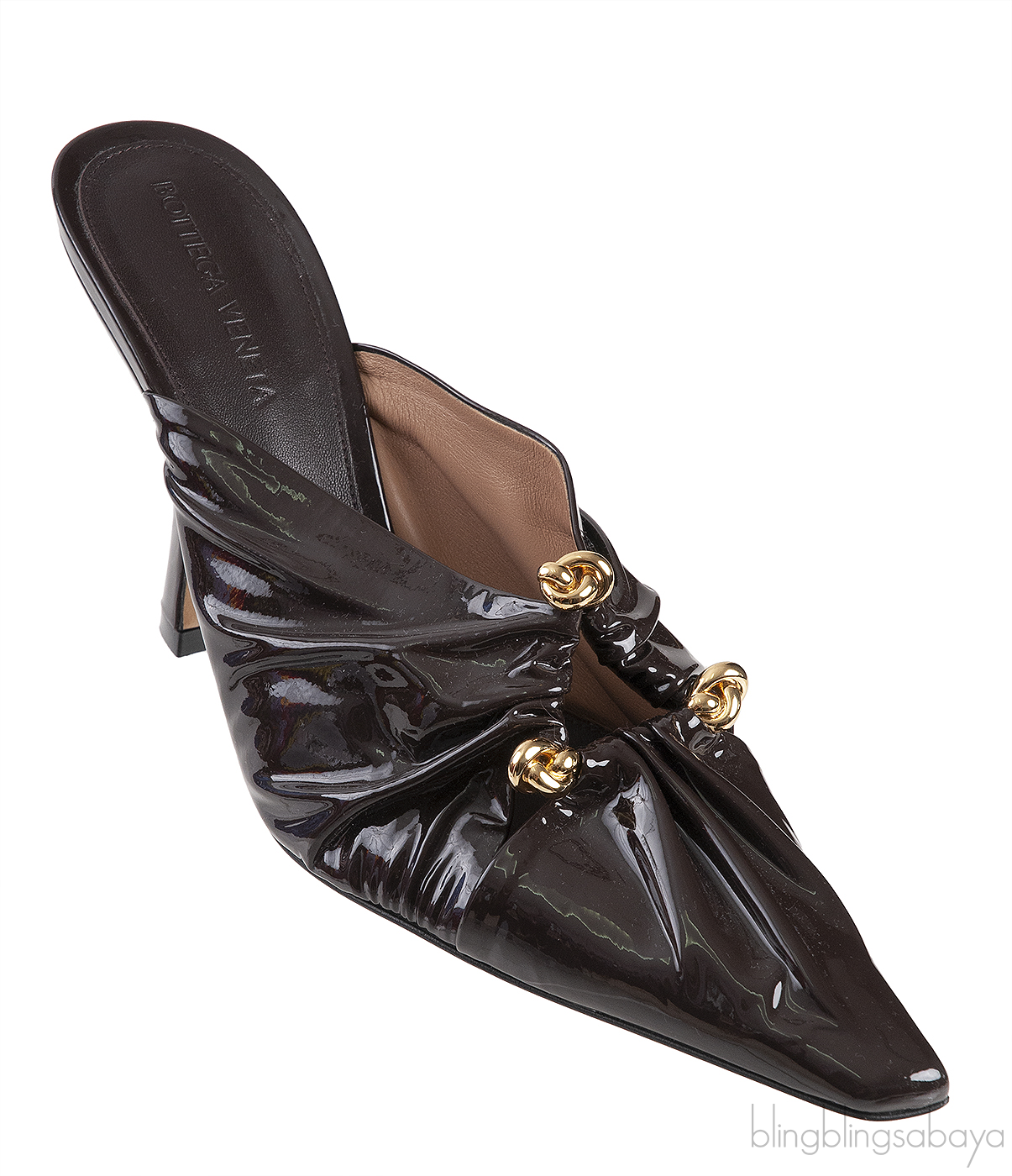 These Fondant Patent Leather Bunny Mules from Bottega Veneta are made from sleek, polished calfskin, showcasing a gathered upper with a decorative golden knotted ring accent. They feature a pointed-toe shape, a leather insole and outsole, and are elevated with 90mm heels for added sophistication.