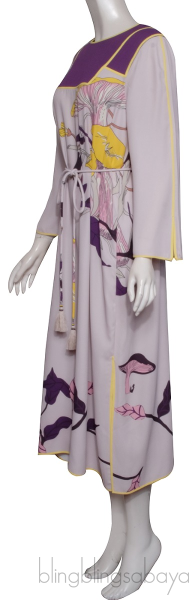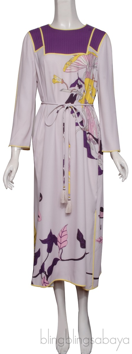 This Beige & Purple Printed Dress from Tory Burch is crafted from 100% Polyester fabric. This dress features a floral print design with round neckline, long sleeves, hook fastening at rear, mid-length with side slits, contrasting purple quilted fabric at too and detachable tassel belt.