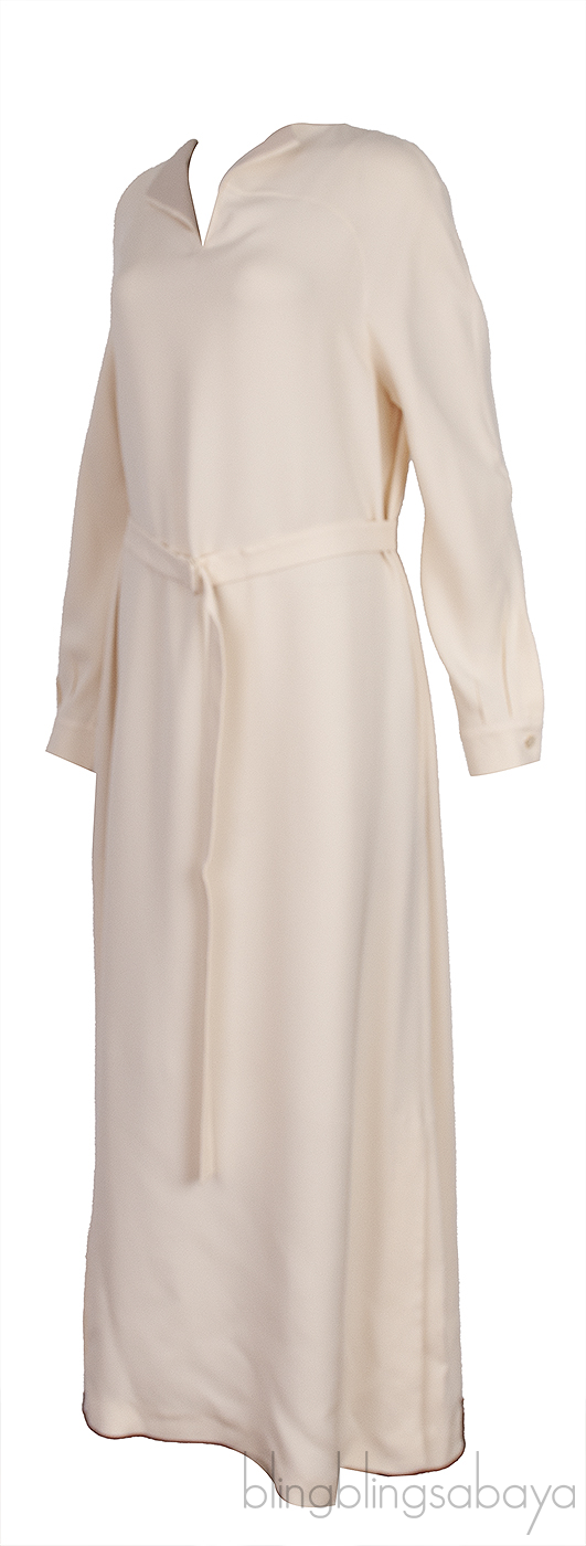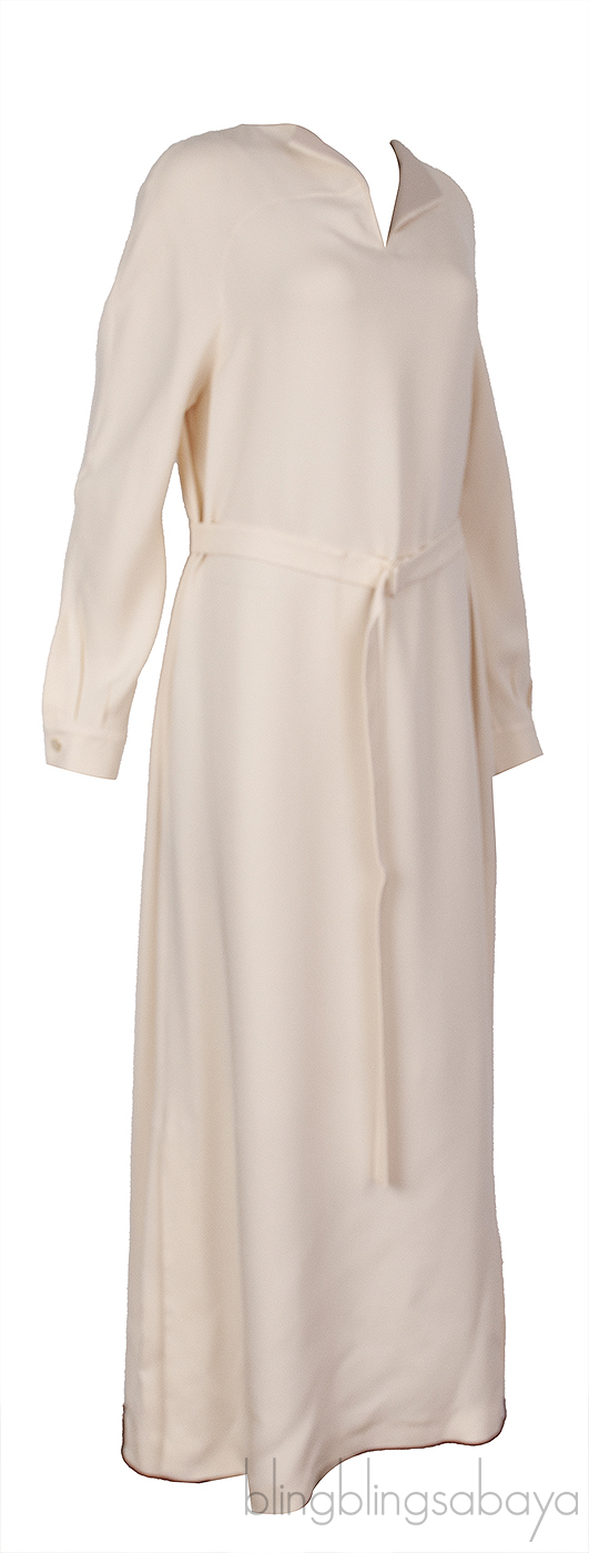 This Beige V-neck Belted Maxi Dress by Loro Piana is made from 100% silk in a soft beige hue. It features a v-neckline, long sleeves with buttoned cuffs, and a flowing maxi length. The dress also includes a detachable belt to cinch the waist.