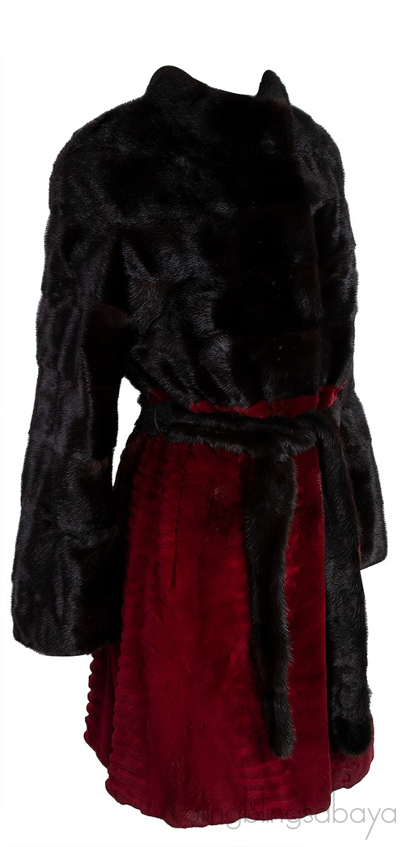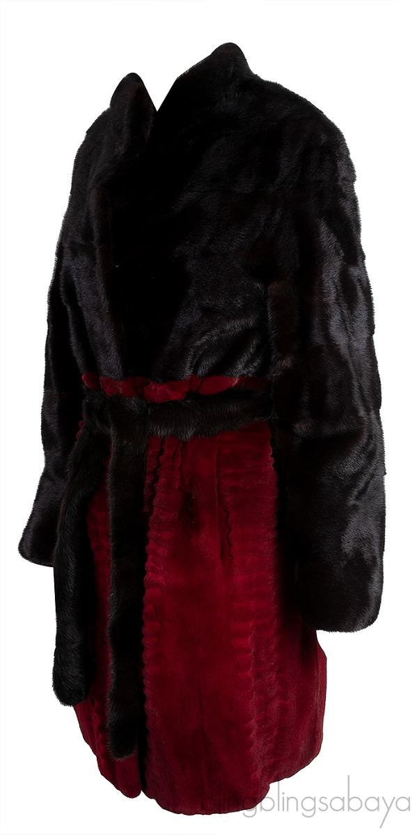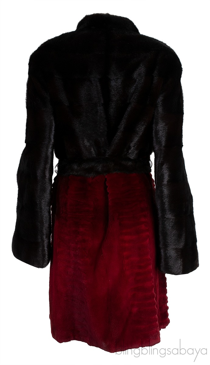 This Bi-color Fur Belted Coat from Saga Furs is crafted from 100% natural fur with black fabric lining brown and red hue. This coat features a close neckline, long sleeves, hook fastening at front, side pockets and comes with detachable belt.