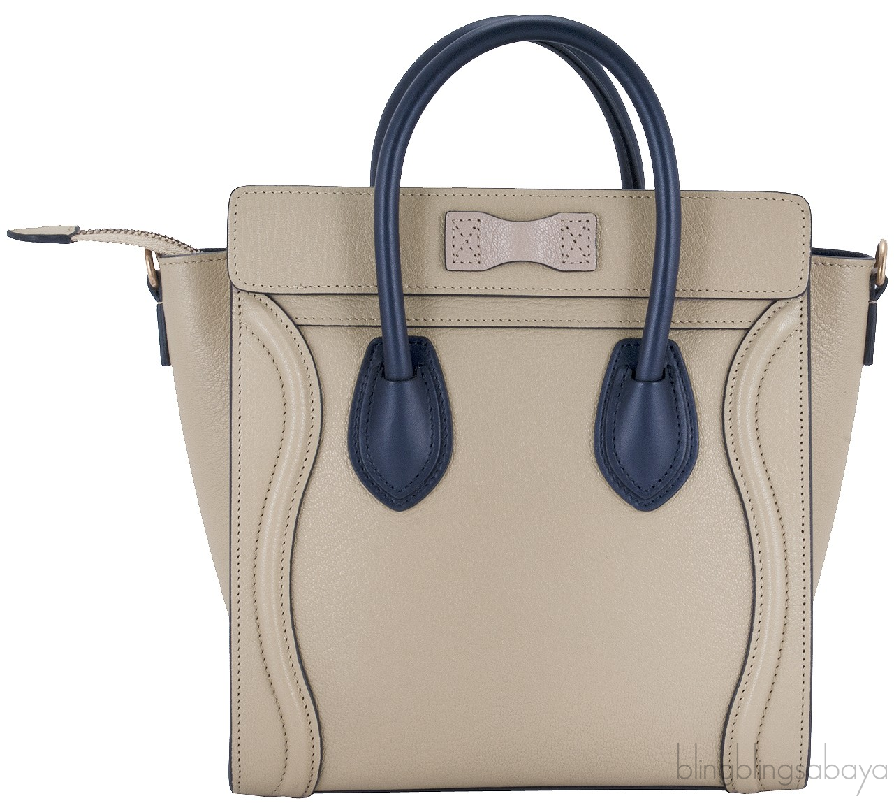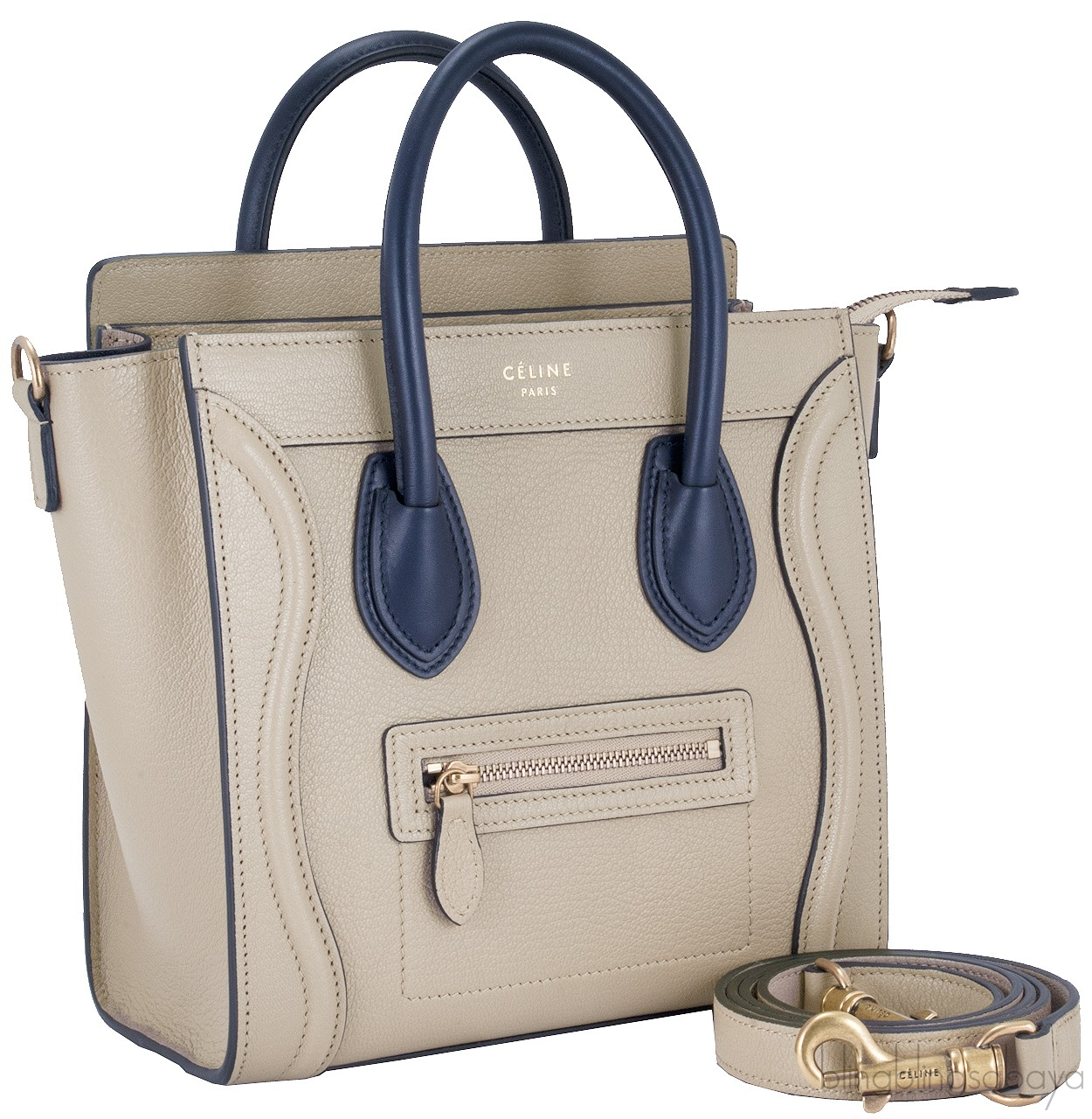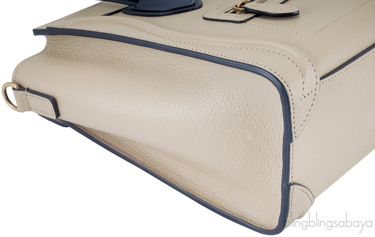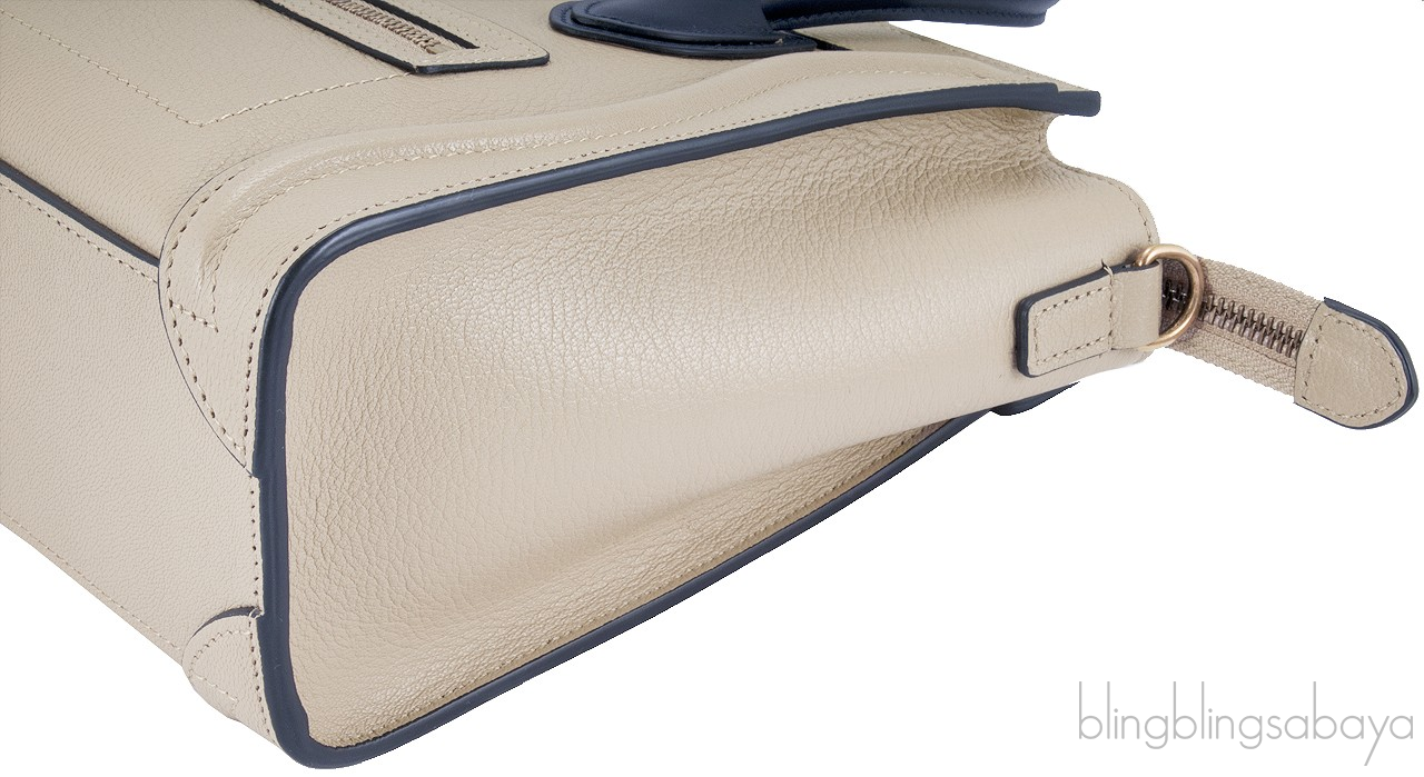 This Bi-Color Nano Luggage from Celine is amzingly crafted in combination of beige leather with navy blue leather handle accented with gold hard ware. This bag features a vertical ridge on both sides that adds a stunning characteristic on front and rear of this lovely bag.