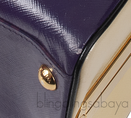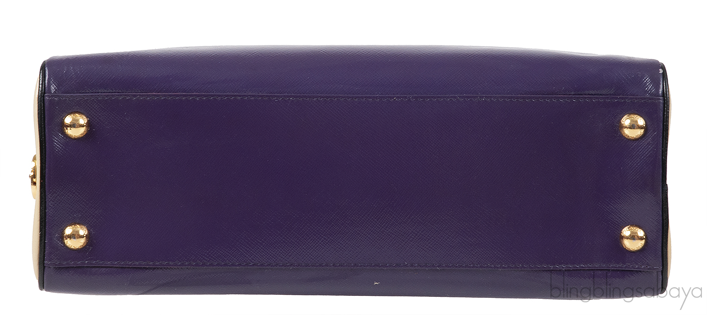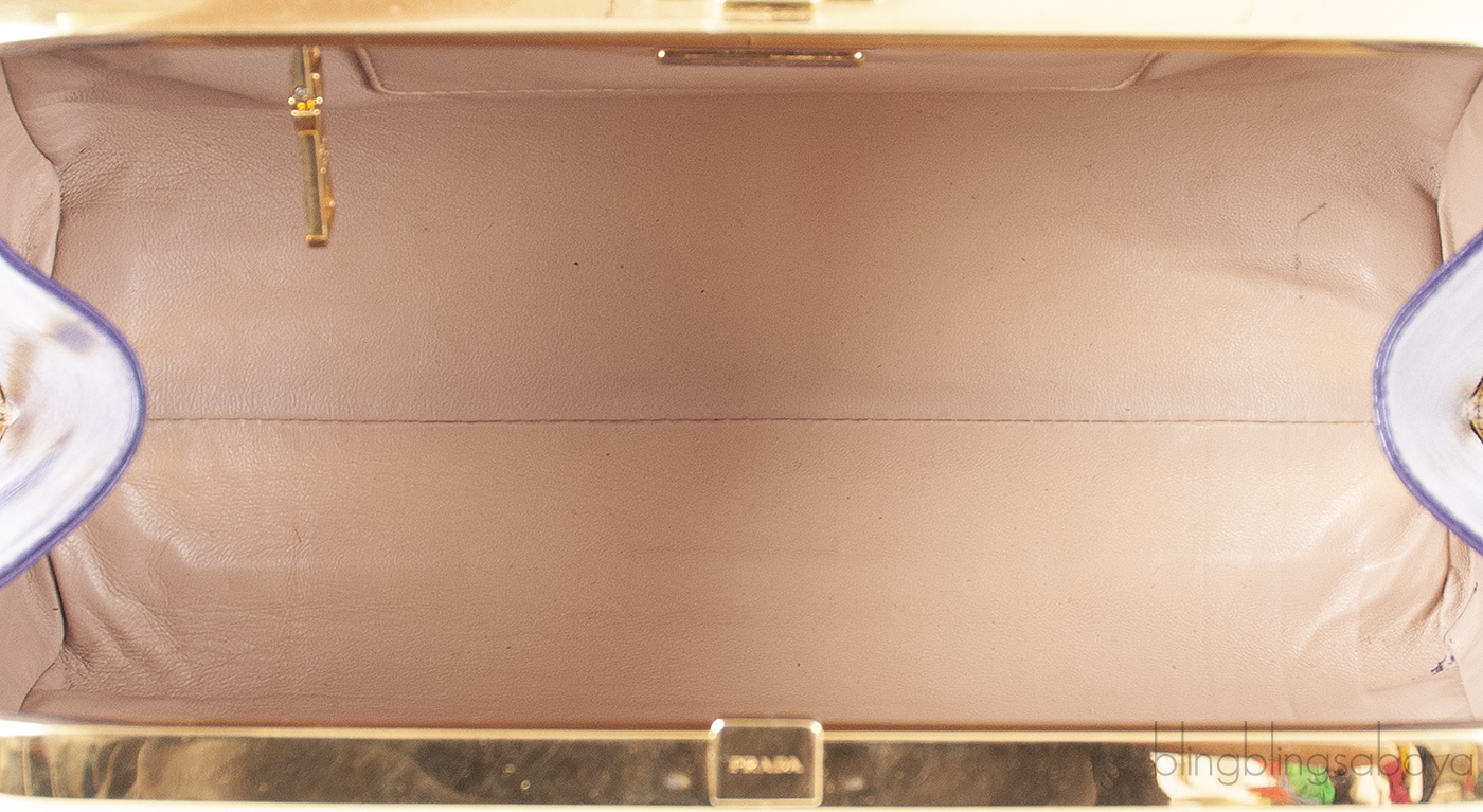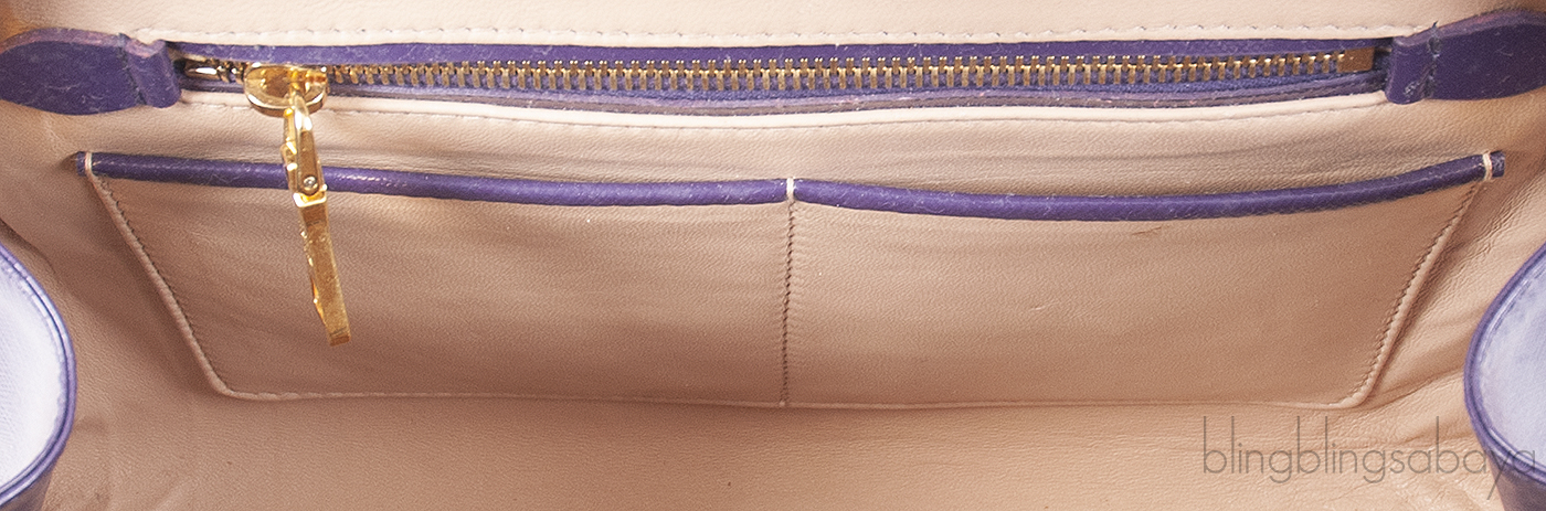This bag has the push lock closure at top to secure and opens to reveal an interior lined with nude leather. Interior features a very roomy interior with two zip wall pockets and three slide pockets trimmed with purple leather.