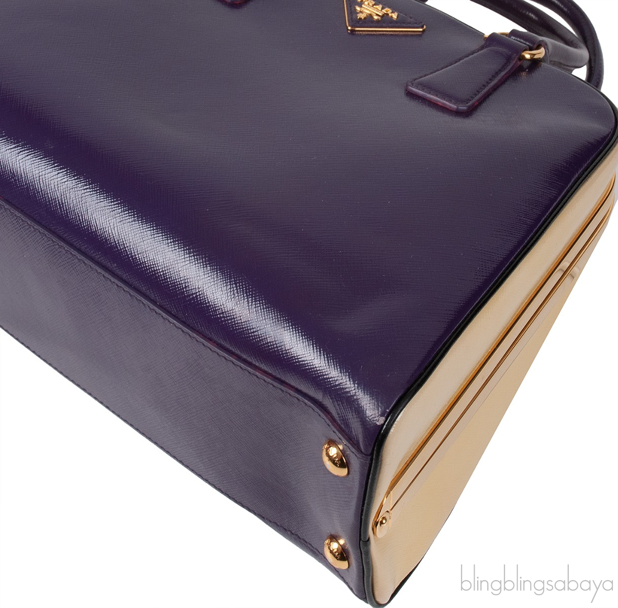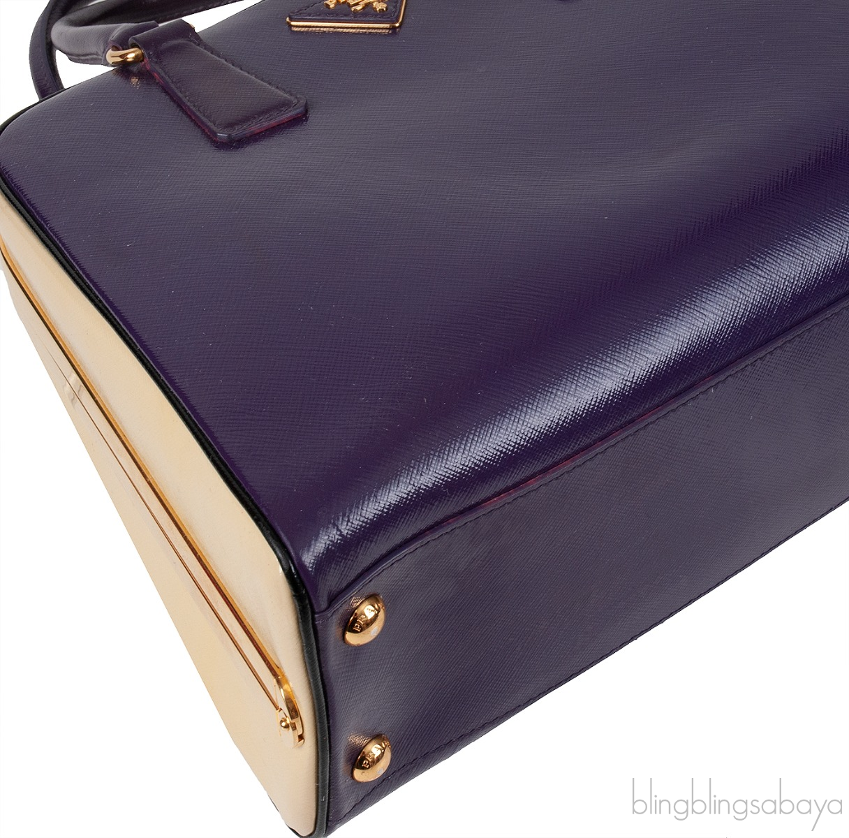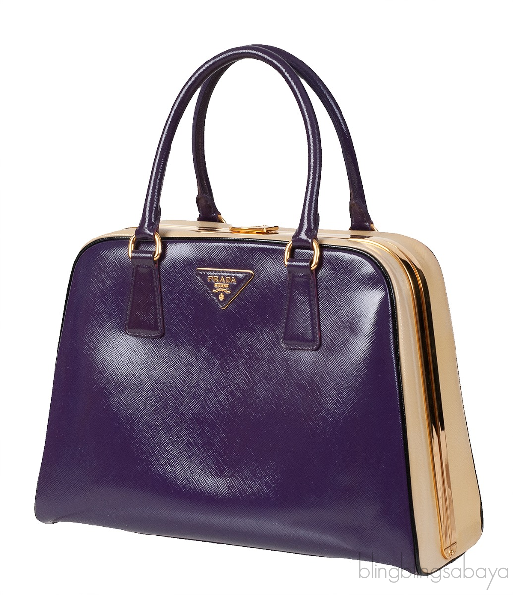 This Bi-color Pyramid Frame Bag from Prada is made of saffiano leather in violet and beige. This bag features a stiff pyramid design with gold metal frame and has two rolled leather handles on top with metal lettering logo2 on a triangle leather at front.
