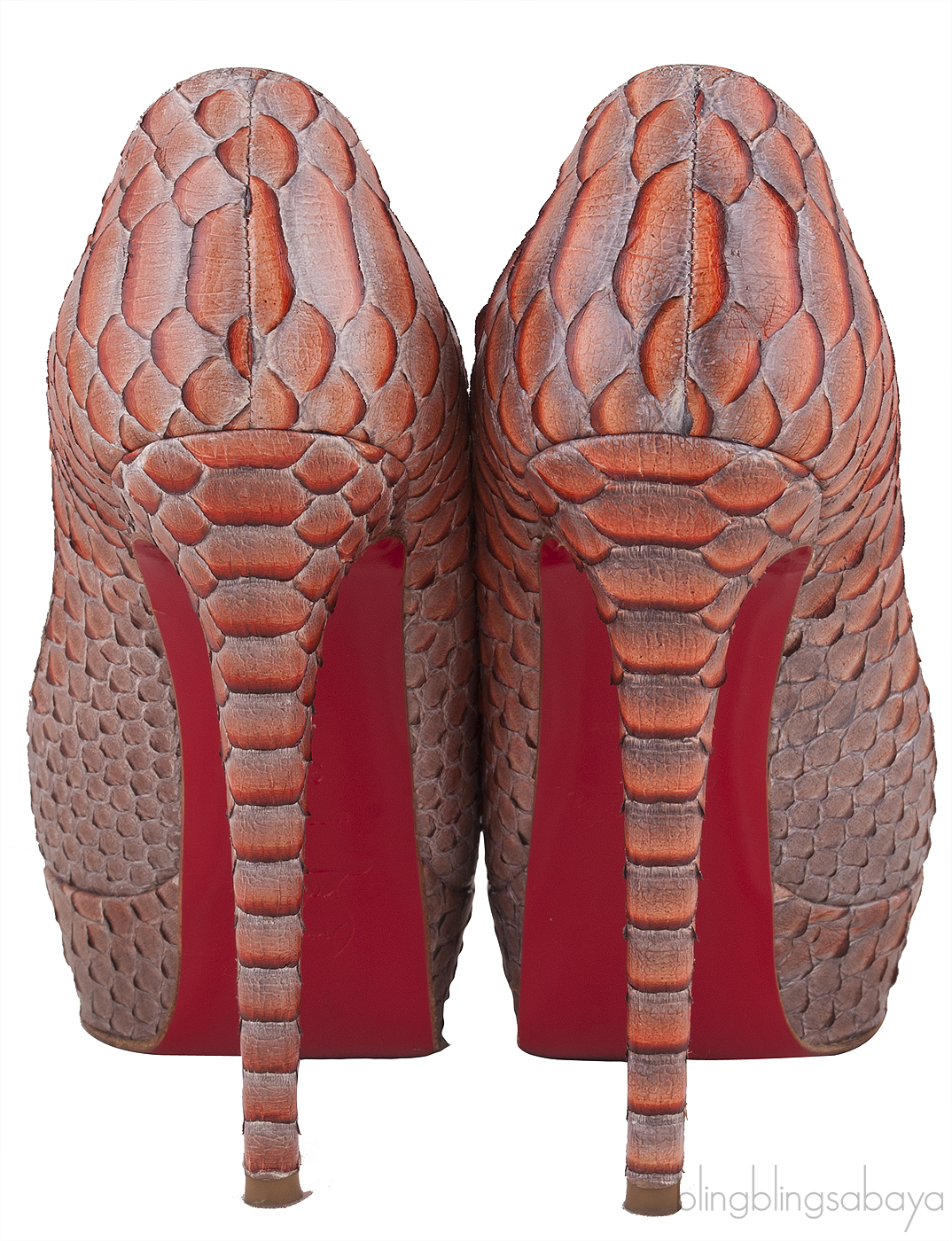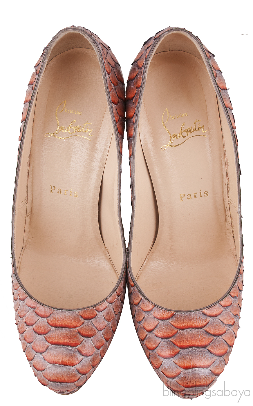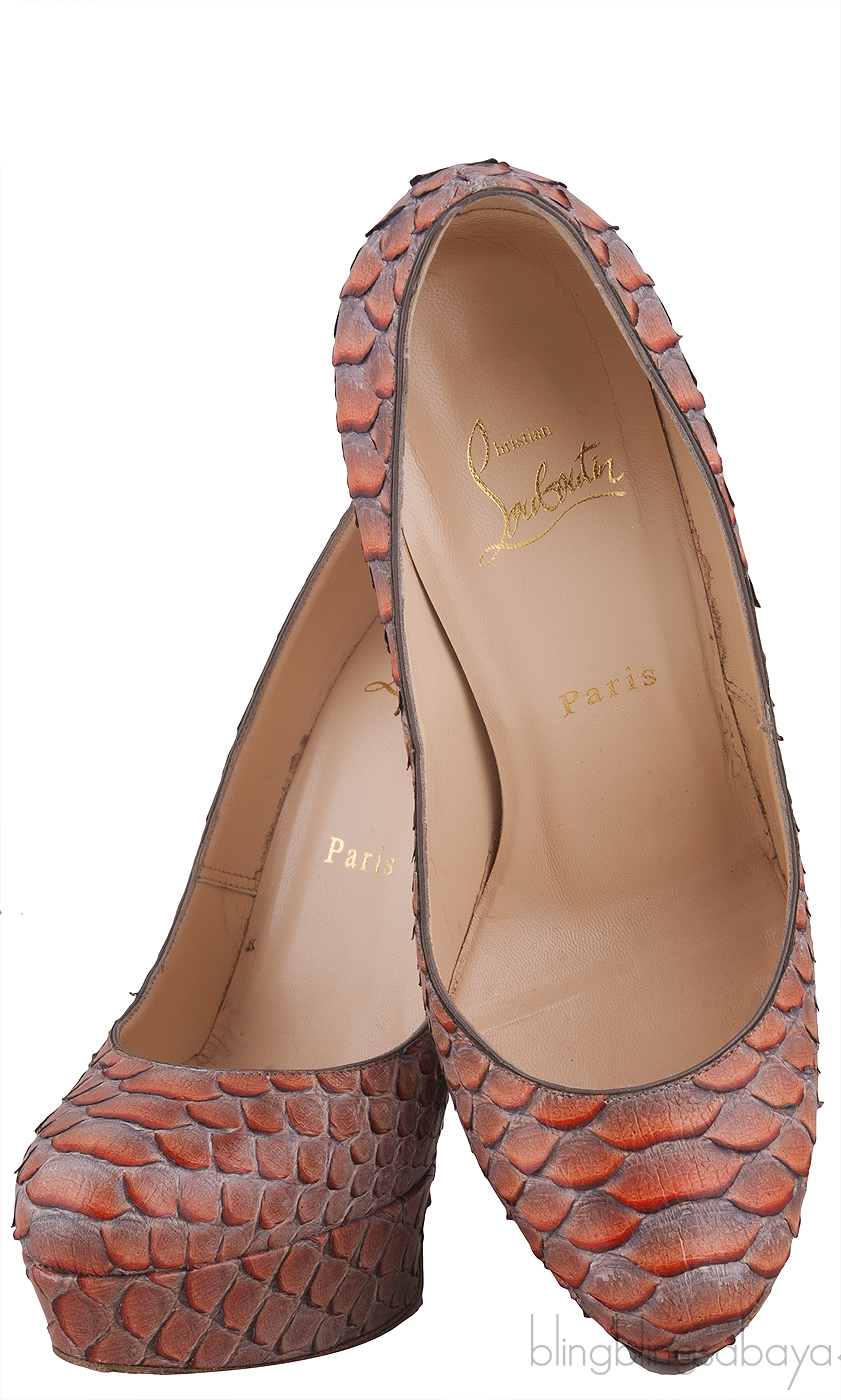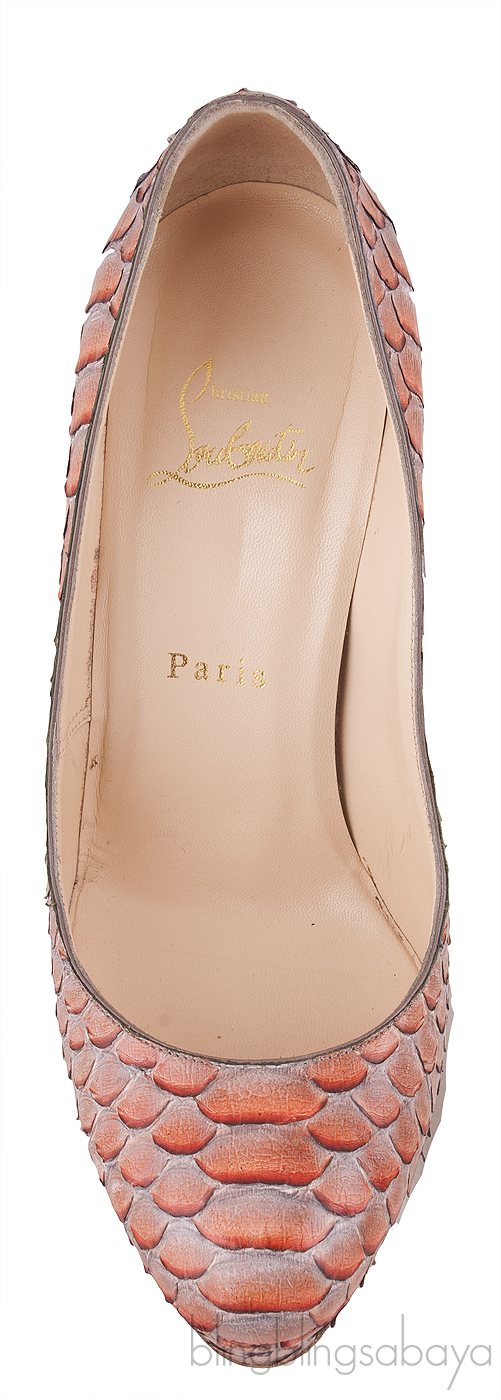 These Bi-color Python Heels from Christian Louboutin are crafted in orange and gray exotic python leather with nude leather lining. These heels features a round almond toe, leather lined insole, heels measuring 5 inches high and signature red leather sole.
