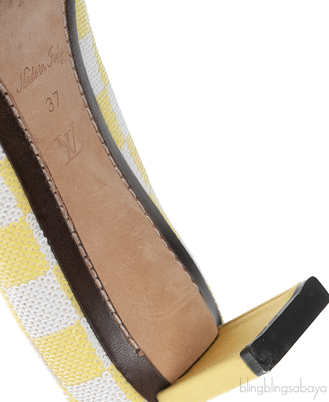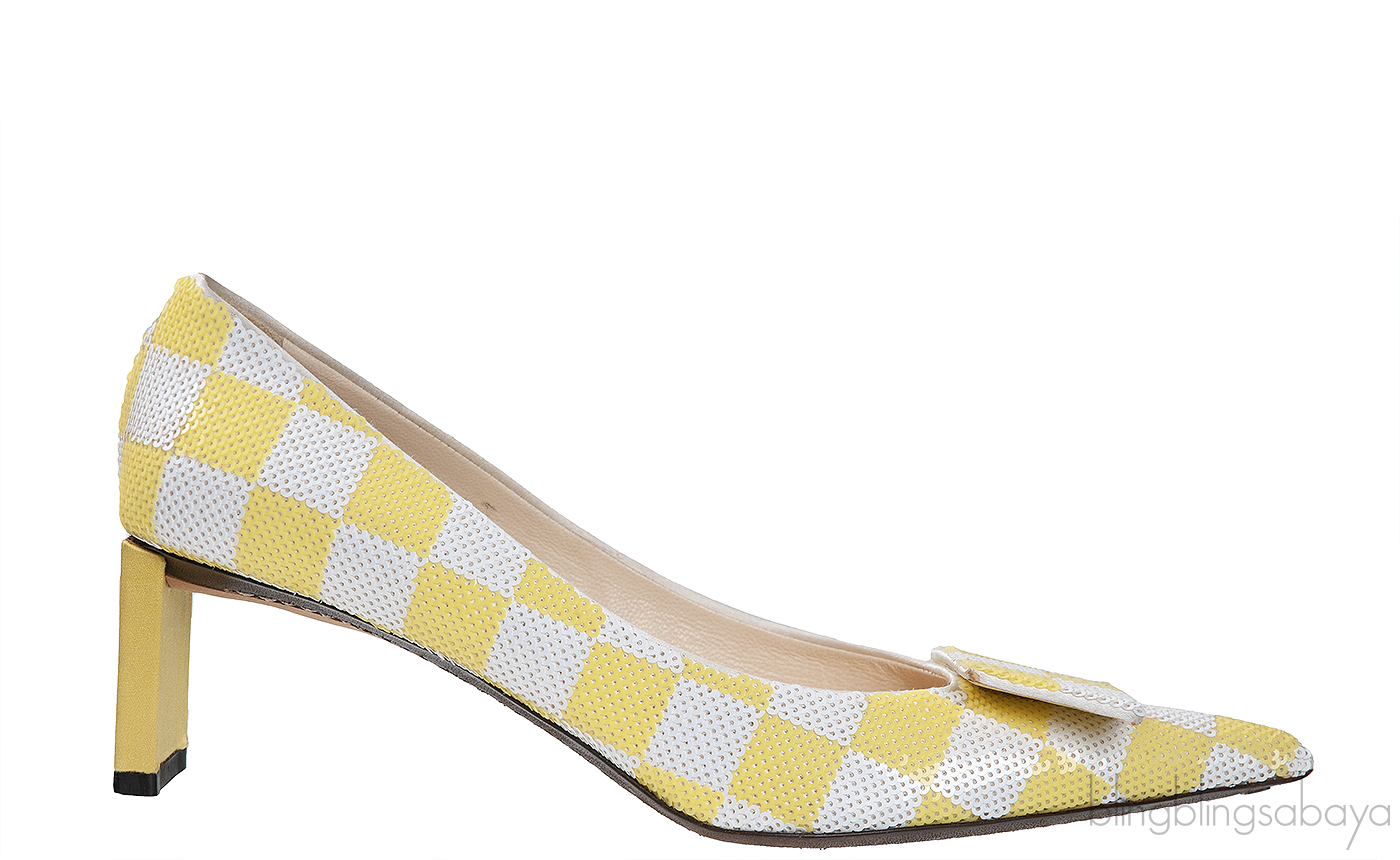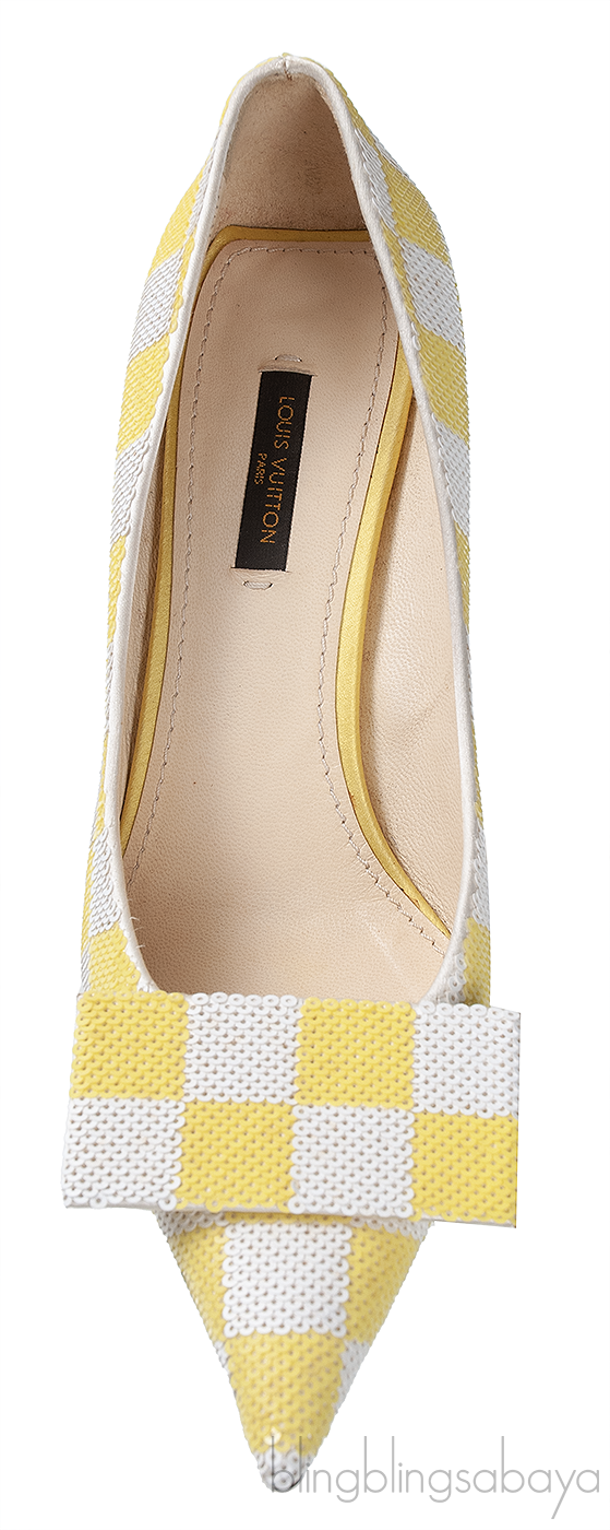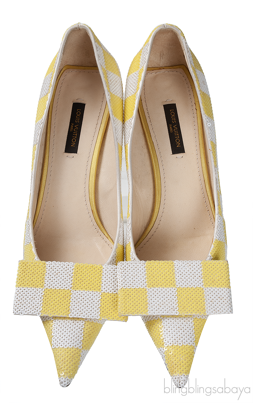 This Sequin Magic Square Satin Pump from Louis Vuitton is crafted in super chic satin fabric fully embellished with sequins in white and yellow hue featuring an artistic square pattern with pointed toe, rectangular bar detailing at vamp, satin covered heel measuring 2.2" with leather insole and sole.