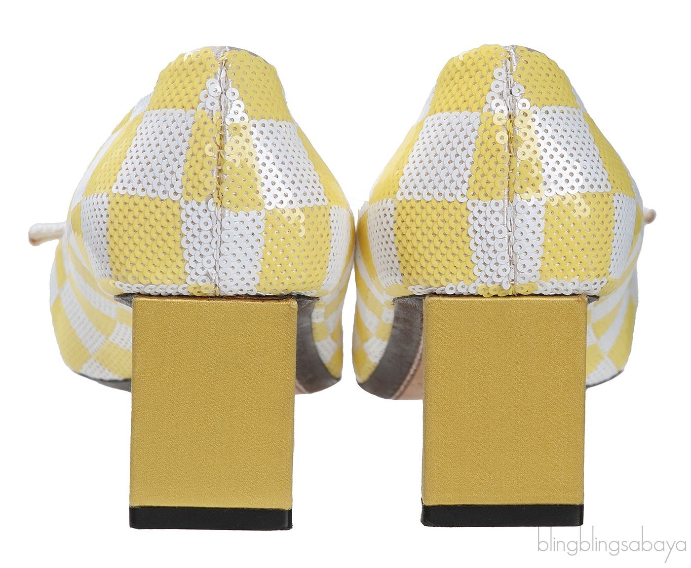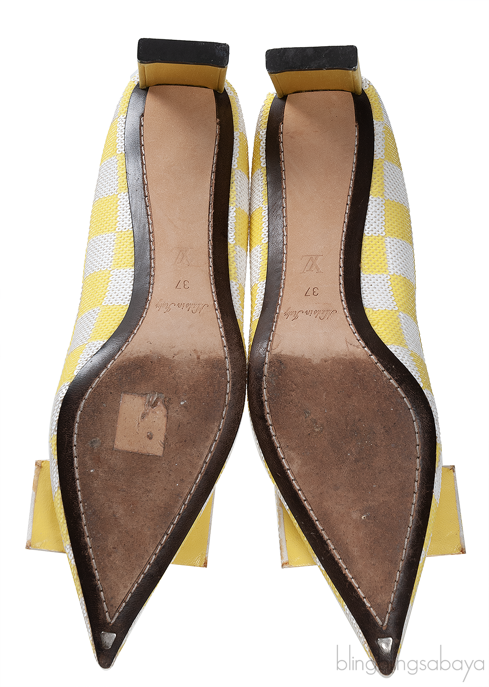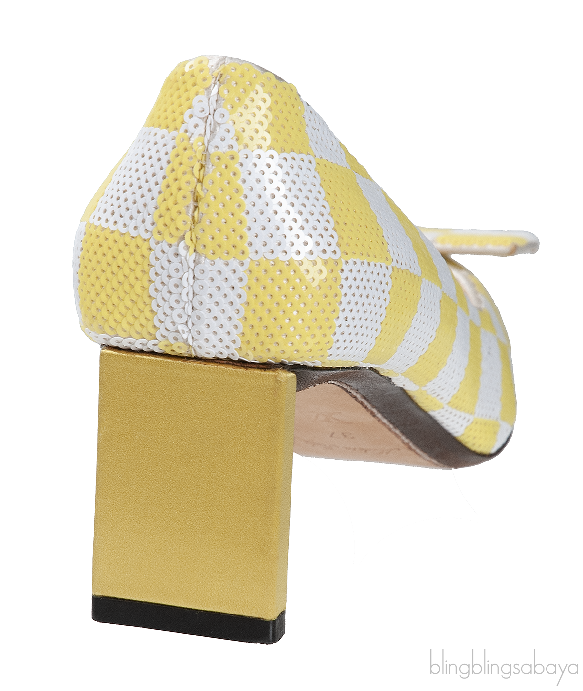 This Sequin Magic Square Satin Pump from Louis Vuitton is crafted in super chic satin fabric fully embellished with sequins in white and yellow hue featuring an artistic square pattern with pointed toe, rectangular bar detailing at vamp, satin covered heel measuring 2.2" with leather insole and sole.