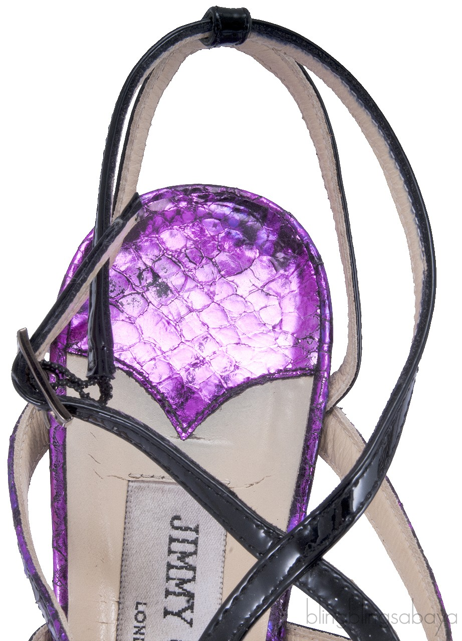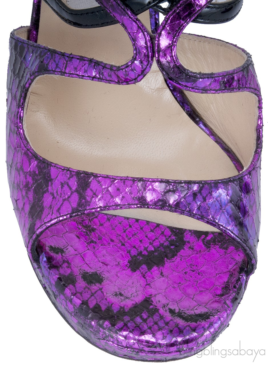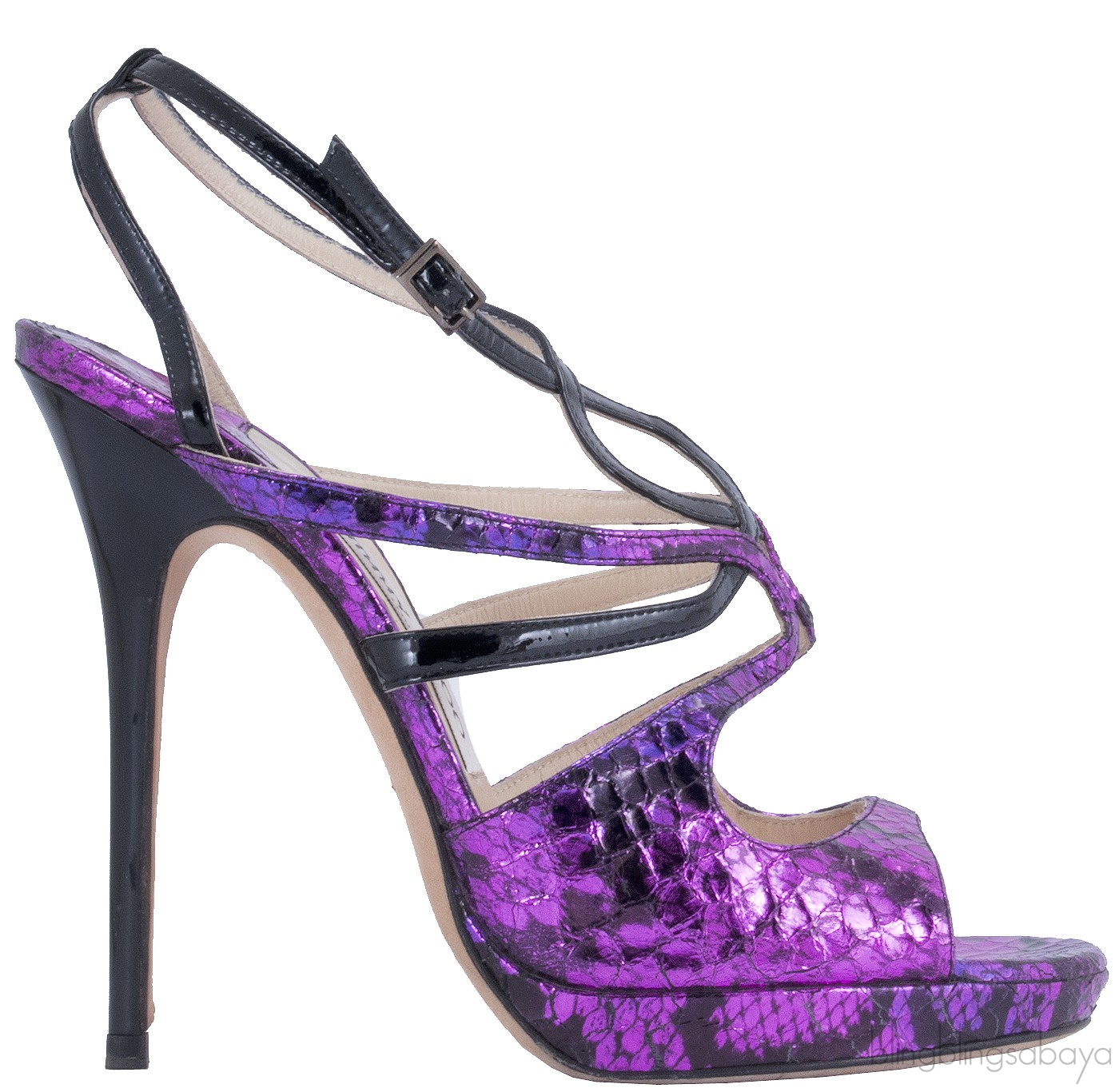 This Bi-color Snakeskin Sandals from Jimmy Choo is crafted in purple snakeskin leather effect upper and black patent leather strap with ruthenium buckle fastening. It has an open round toe, high covered heels measuring 120 mm and leather lined insole & sole.