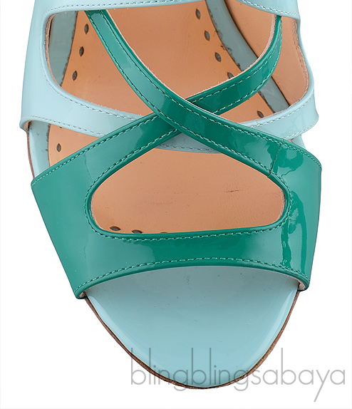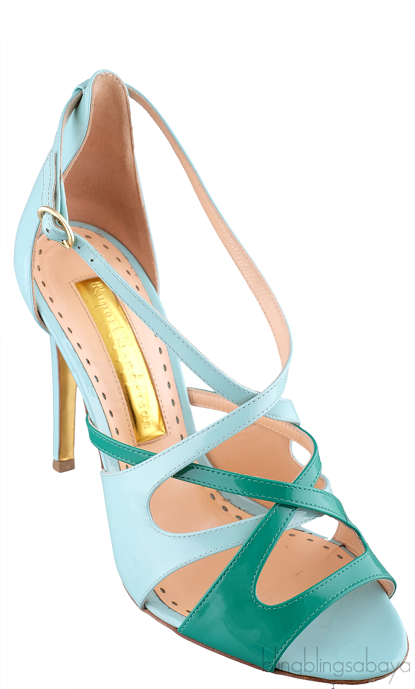 These Bi-color Strappy Heels from Rupert Sanderson are crafted in patent bi-color strappy upper with nude leather lining. These sandals features a patent light blue and patent green criss-cross strap with gold buckle fastening, padded leather insole, heels measuring 105 mm high and leather sole.
