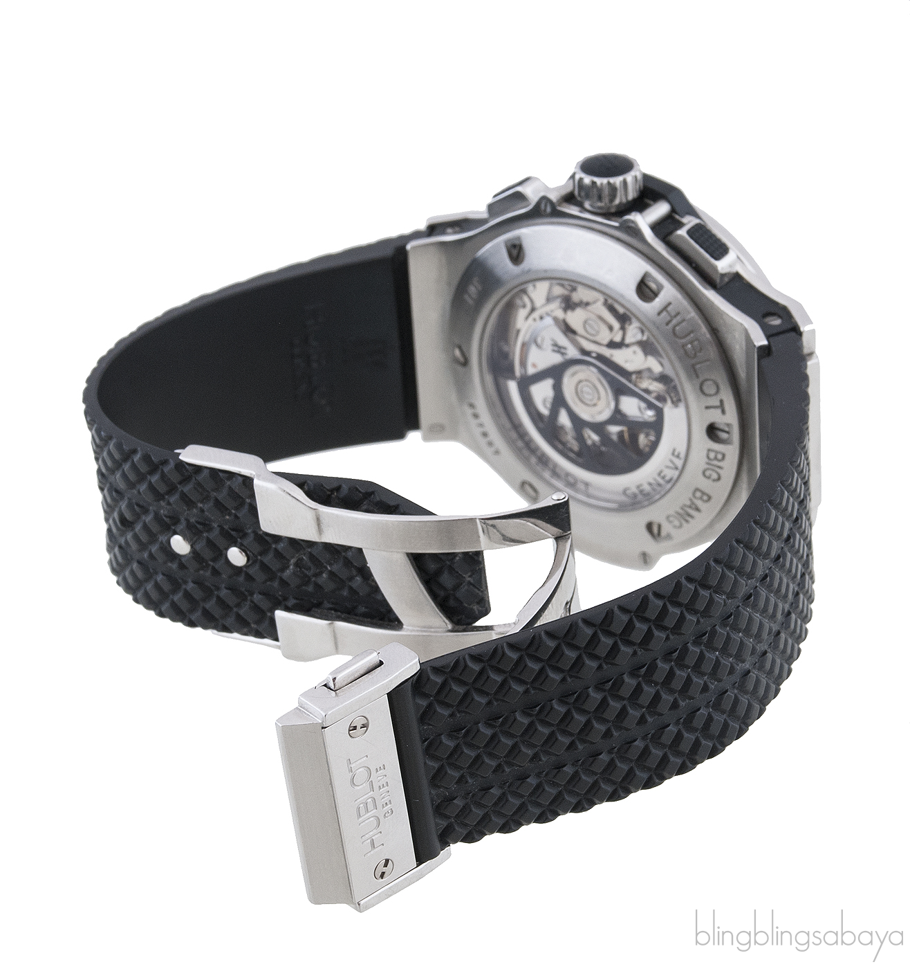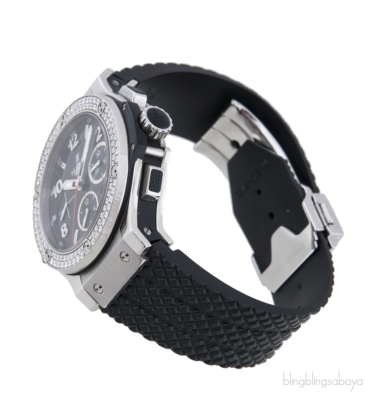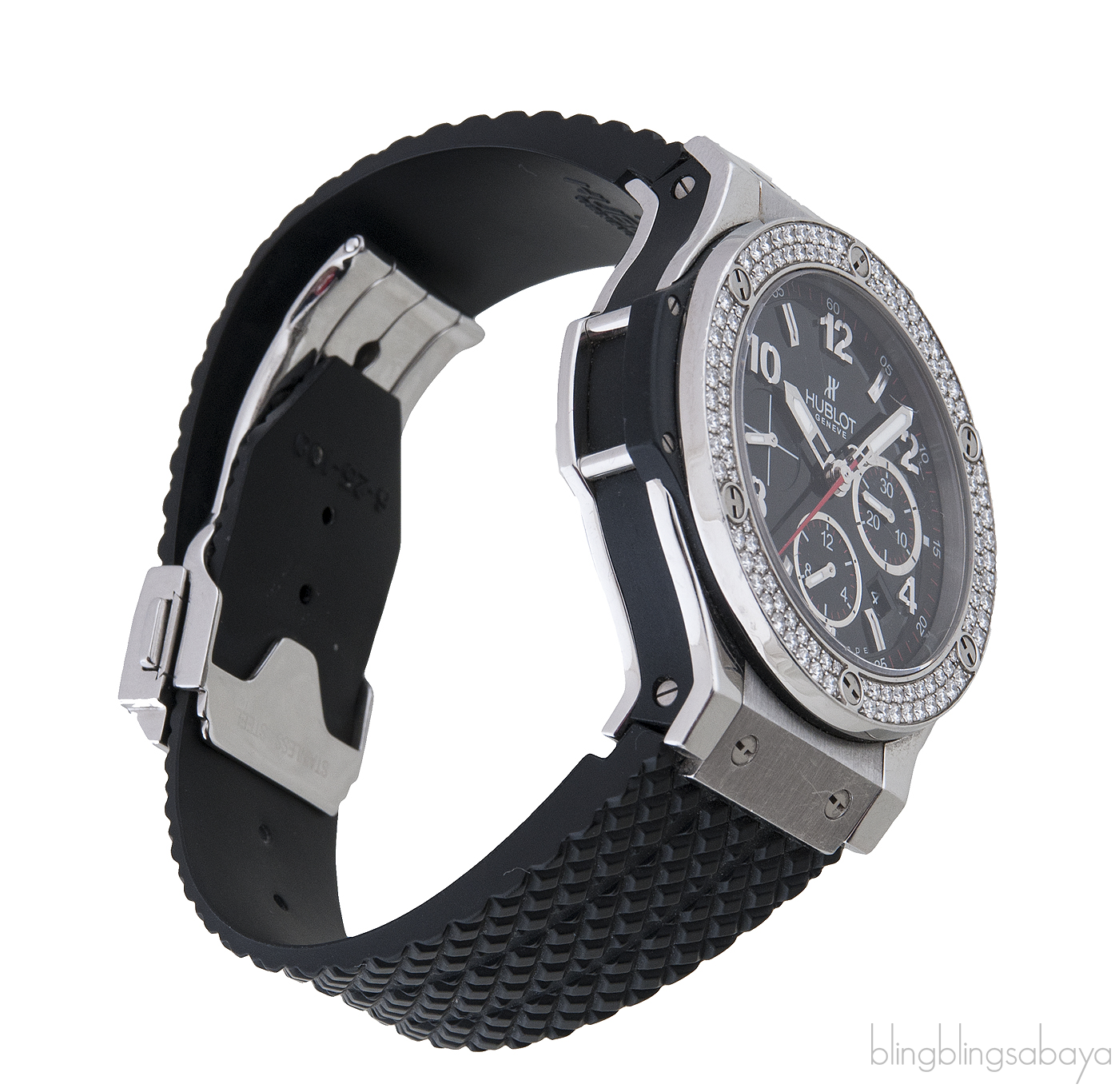This Big Bang Steel Diamond Watch for Men from Hublot's Big Bang Collection features a silver-tone stainless steel case measuring 41 mm with black rubber bracelet. Date window displayed between 4 & 5 o'clock position, sapphire glass, steel bezel set with diamonds. Chronograph, automatic winding mechanism, 27 jewels and push lock steel closure.