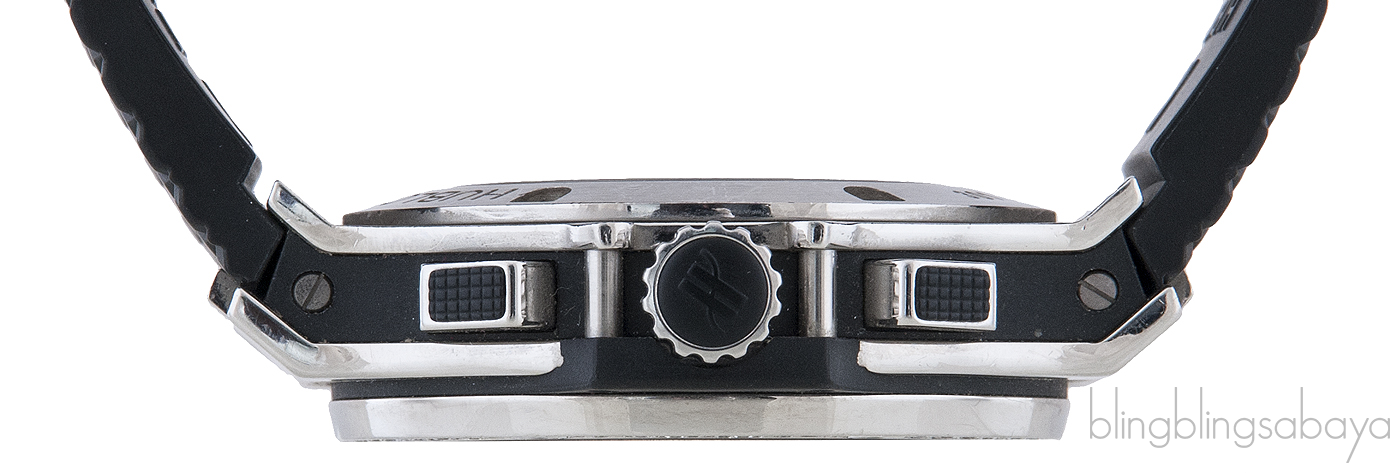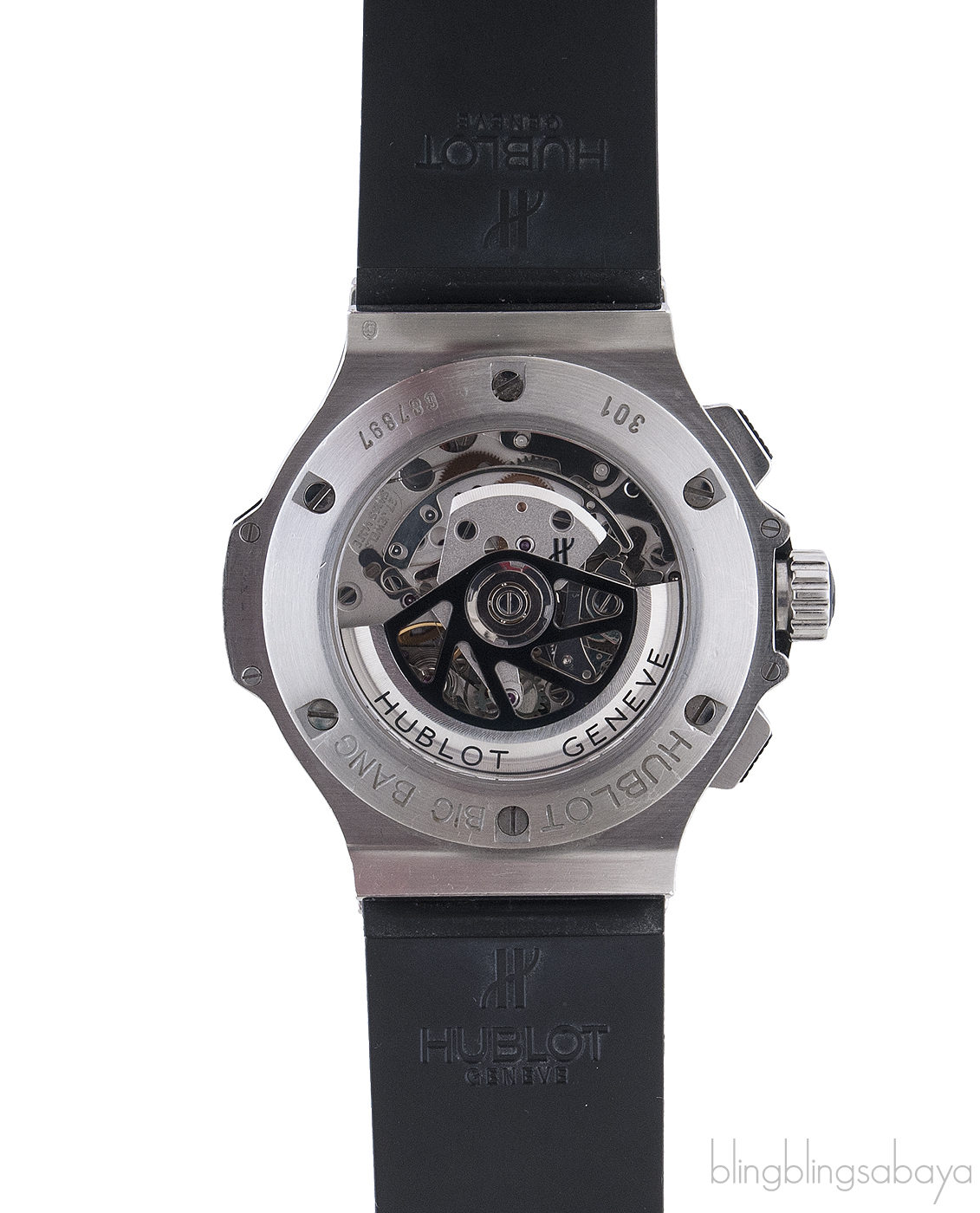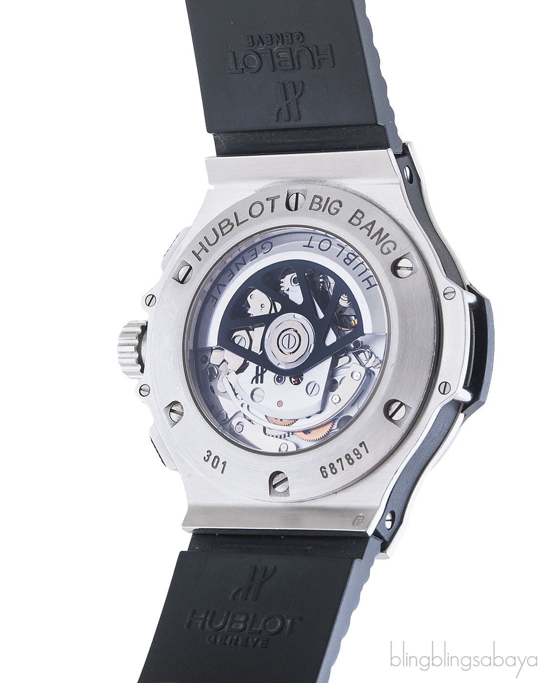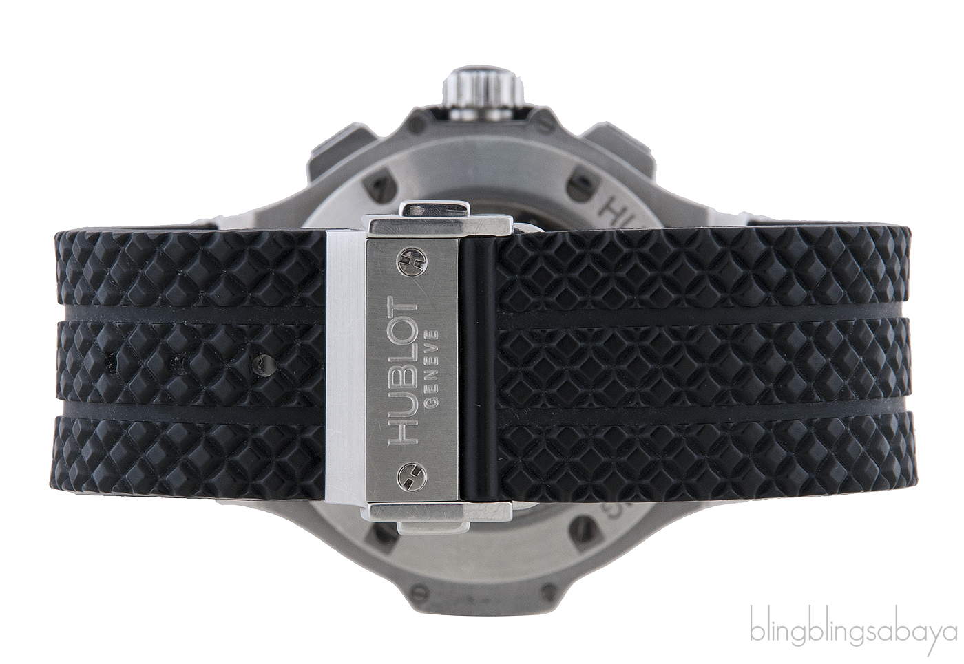 This Big Bang Steel Diamond Watch for Men from Hublot's Big Bang Collection features a silver-tone stainless steel case measuring 41 mm with black rubber bracelet. Date window displayed between 4 & 5 o'clock position, sapphire glass, steel bezel set with diamonds. Chronograph, automatic winding mechanism, 27 jewels and push lock steel closure.