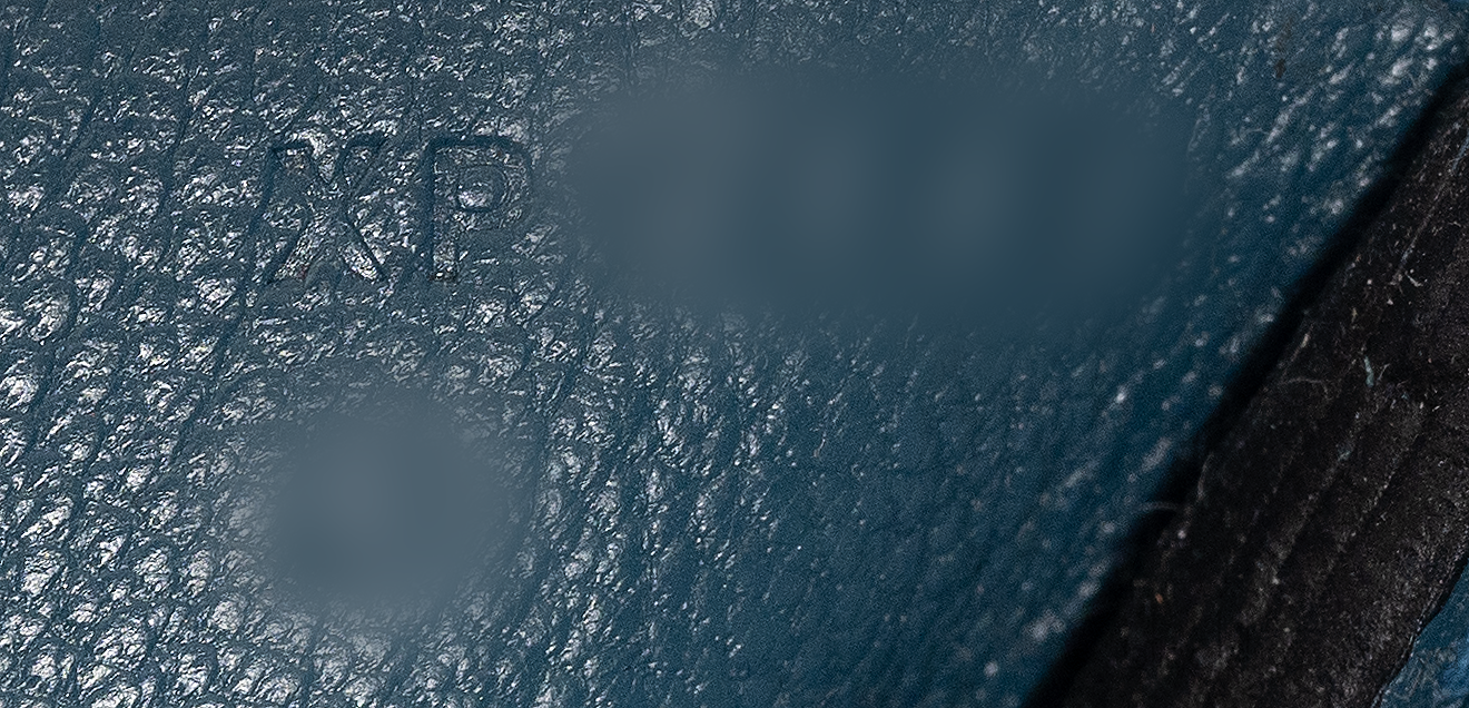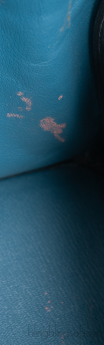 Excellent Condition! light to noticeable discoloration at the back and base, some scratches on corners, light scratches on hardware, noticeable stains on the interior leather