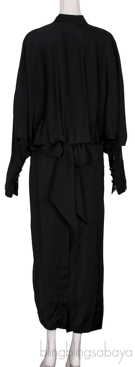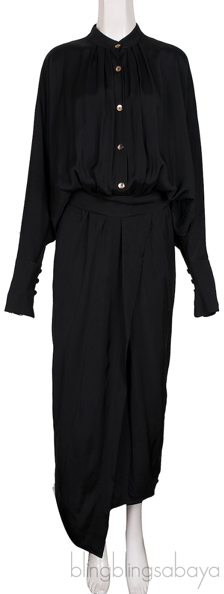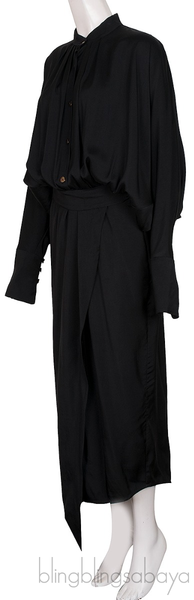 This Black Asymmetric Midi Dress from Petar Petrov is crafted from 73% Viscose, 23% Silk & 4% Elastane fabric in black hue . This dreass features a structured pleated bodice, balloon sleeves with buttoned cuffs, close neckline, and a wrap-effect asymmetric skirt.