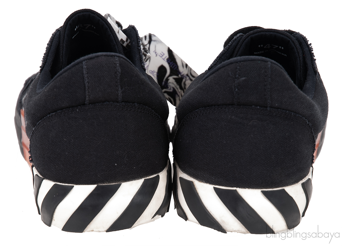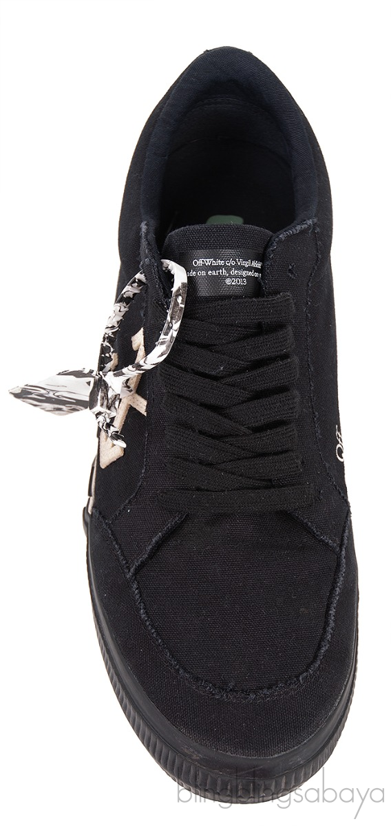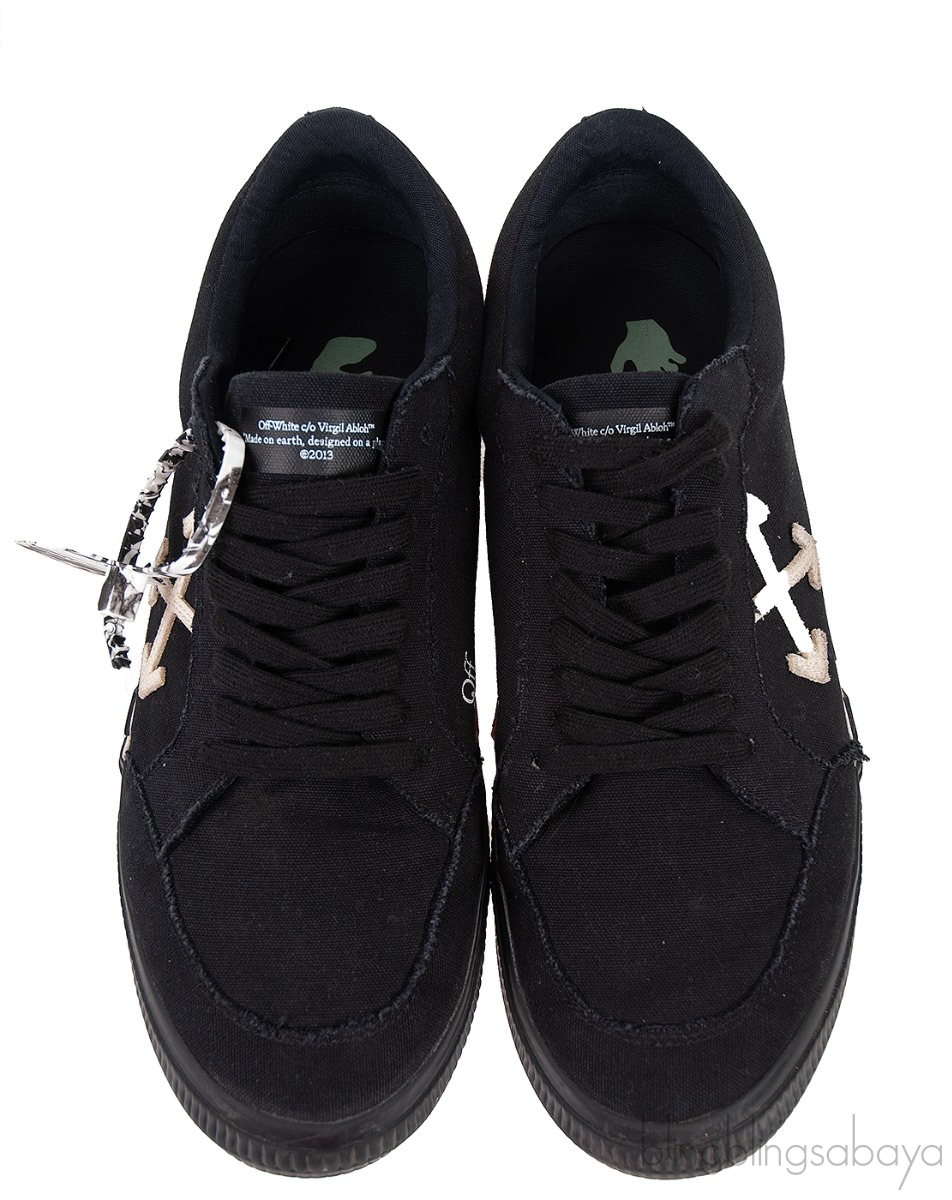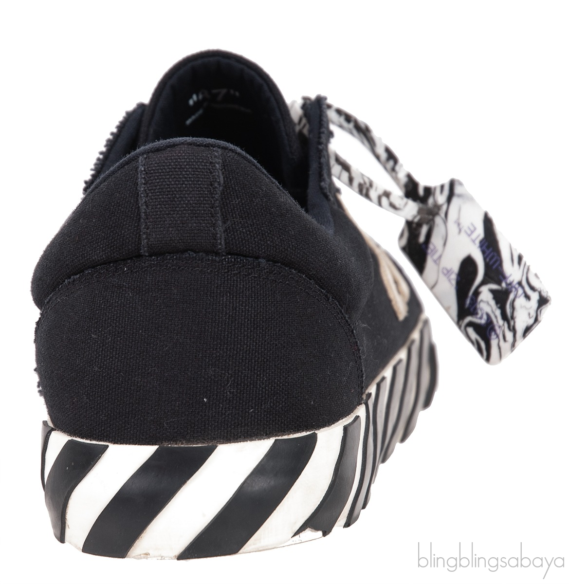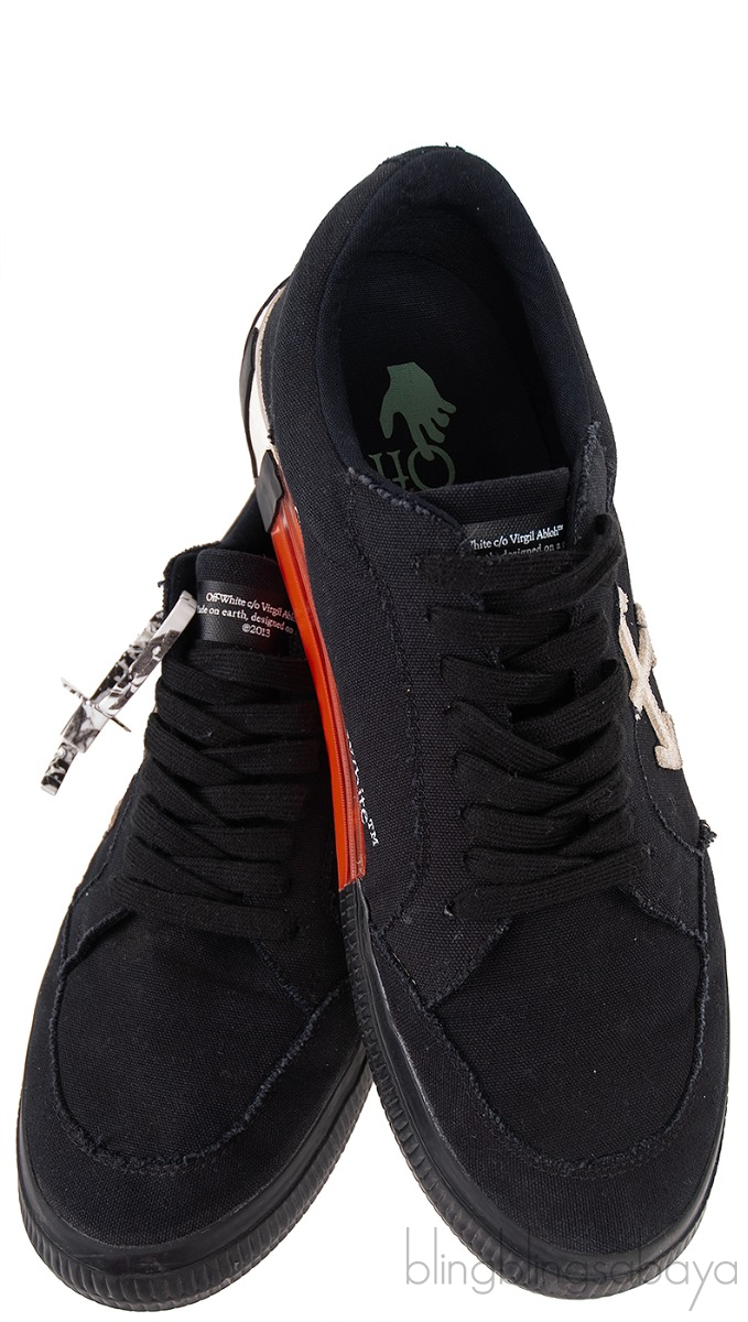This pair of Black Canvas Men's Sneaker from Off-white is crafted from black canvas upper. These shoes features na almod toe, shoe laces at front, white logo2 patch on the side, logo2 print, canvas lining and rubber sole.