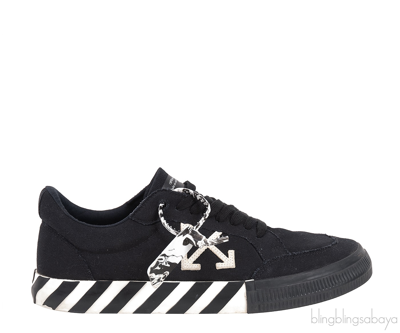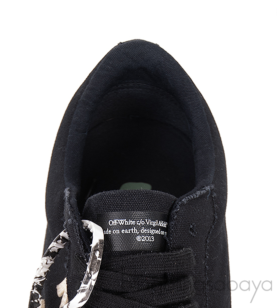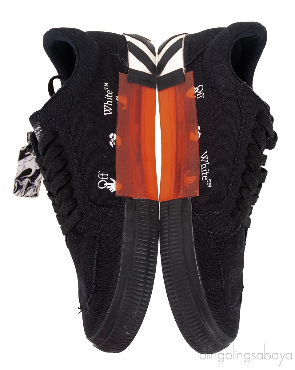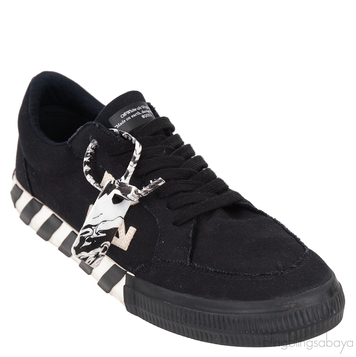 This pair of Black Canvas Men's Sneaker from Off-white is crafted from black canvas upper. These shoes features na almod toe, shoe laces at front, white logo2 patch on the side, logo2 print, canvas lining and rubber sole.