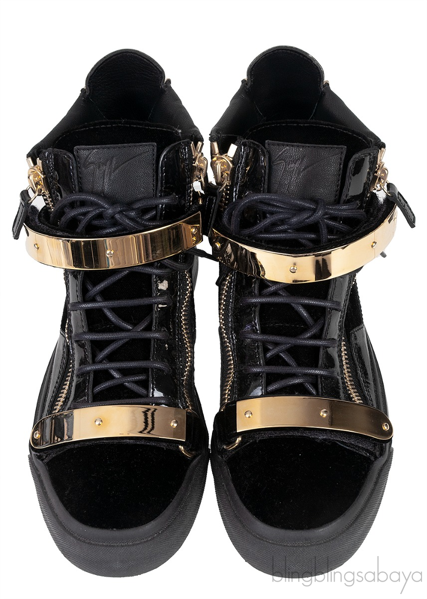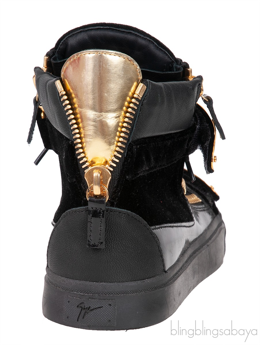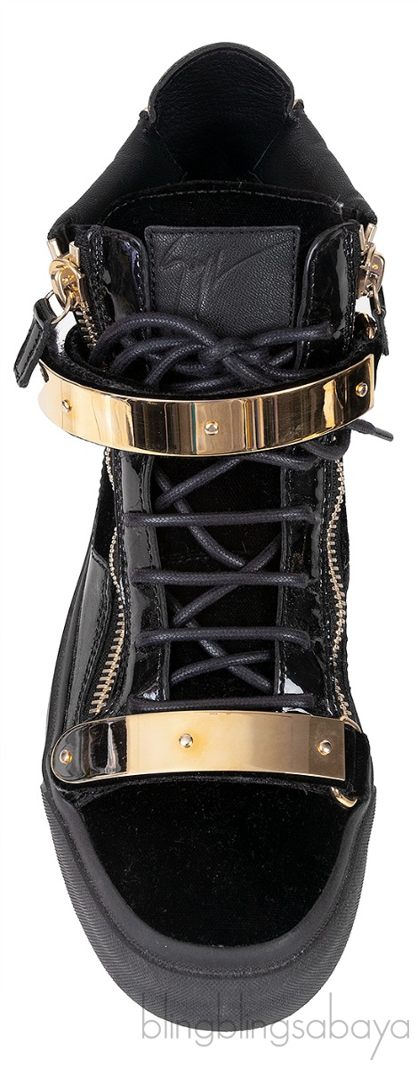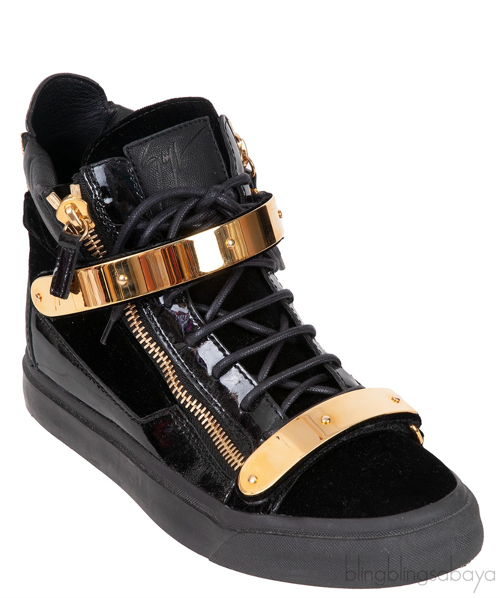 These Black Coby High Cut Sneaker from Giuseppe Zanotti features a velvet upper with patent leather inserts and a rubber sole, a gold metal logo2ed double strap. gold-colored zipper details on the upper, lace-up closure.
