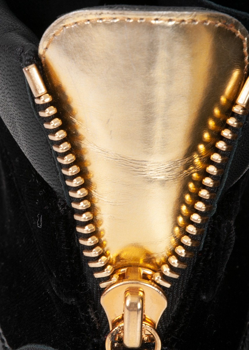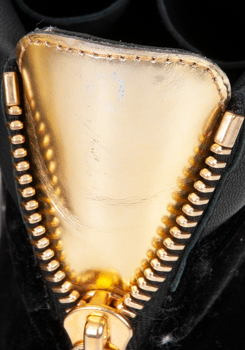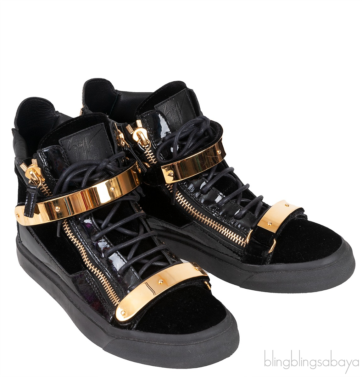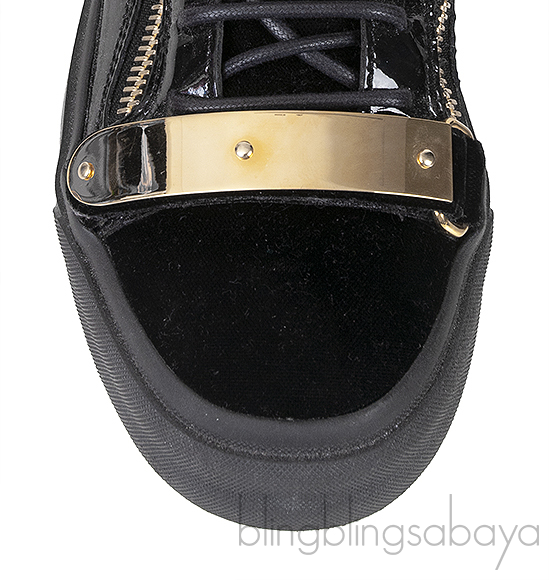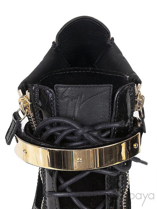 These Black Coby High Cut Sneaker from Giuseppe Zanotti features a velvet upper with patent leather inserts and a rubber sole, a gold metal logo2ed double strap. gold-colored zipper details on the upper, lace-up closure.