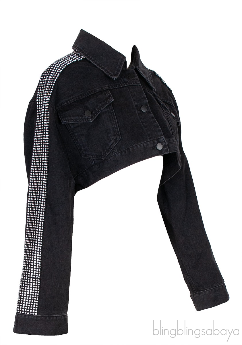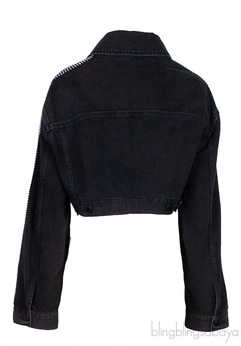 This Black Denim Crystal Shoulder Crop Jacket from Christopher Kane is crafted from 100% Cotton in black featuring a classic collar, button fastening at front, front pocket with flap cover, crystal embellished long sleeves with button cuffs.